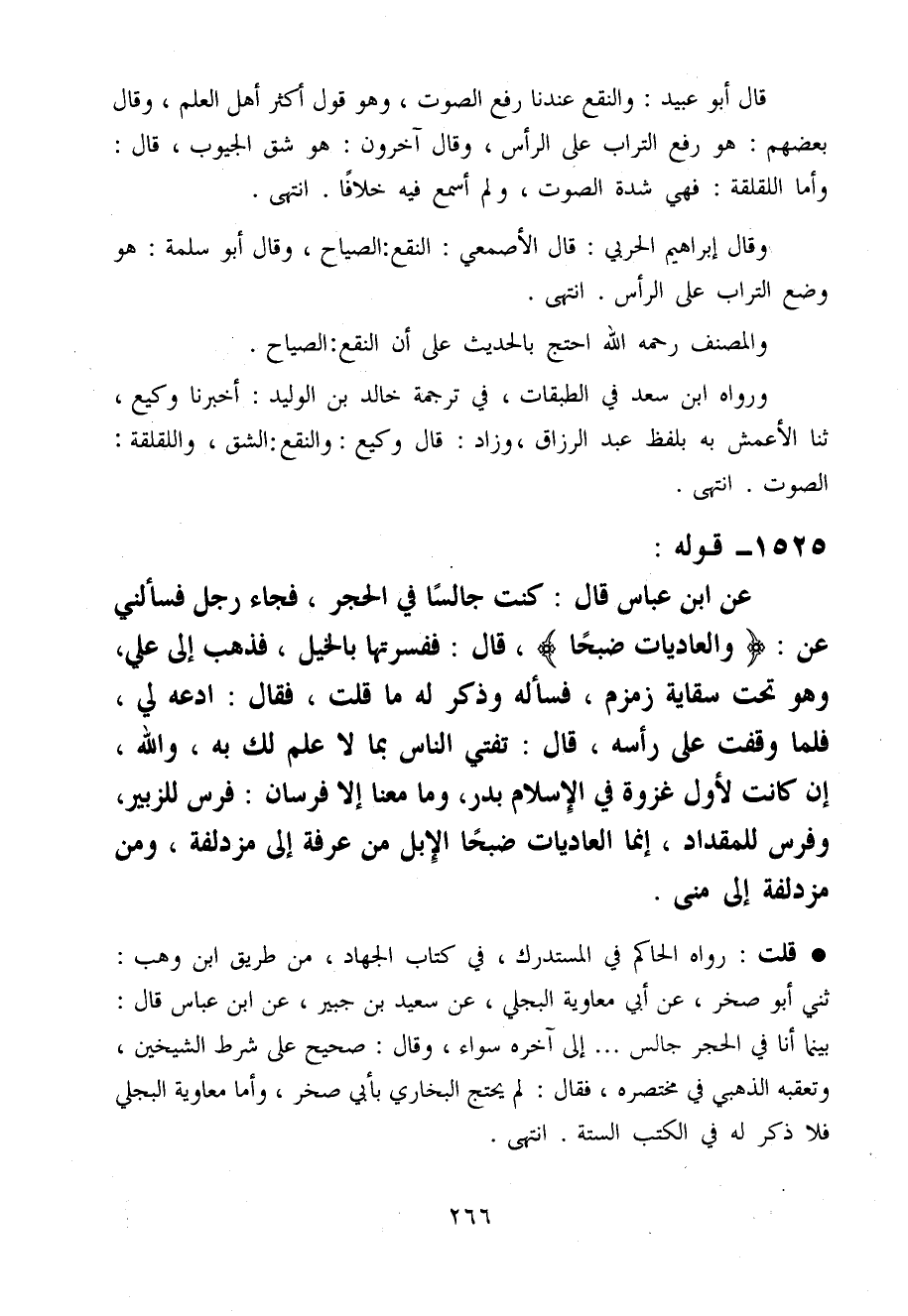 عَن ابْن عَبَّاس قَالَ كنت جَالِسا فِي الْحجر فجَاء رجل فَسَأَلَنِي عَن وَالْعَادِيات ضَبْحًا قَالَ ففسرتها بِالْخَيْلِ فَذهب إِلَى عَلّي وَهُوَ تَحت سِقَايَة زَمْزَم فَسَأَلَهُ وَذكر لَهُ مَا قلت فَقَالَ ادْعُه لي فَلَمَّا وقفت عَلَى رَأسه قَالَ تُفْتِي النَّاس بِمَا لَا علم لَك بِهِ وَالله إِن كَانَت لأوّل غَزْوَة فِي الْإِسْلَام بدر وَمَا مَعنا إِلَّا فرسَان فرس للزُّبَيْرِ وَفرس لِلْمِقْدَادِ إِنَّمَا العاديات ضَبْحًا الْإِبِل من عَرَفَة إِلَى مُزْدَلِفَة وَمن مُزْدَلِفَة إِلَى منى