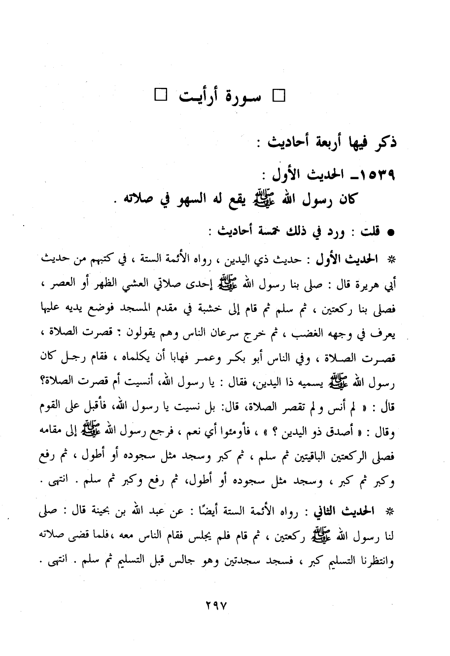 الحَدِيث الأول حَدِيث ذِي الْيَدَيْنِ رَوَاهُ الْأَئِمَّة السِّتَّة فِي كتبهمْ من حَدِيث أبي هُرَيْرَة قَالَ صَلَّى بِنَا رَسُول الله صَلَّى اللَّهُ عَلَيْهِ وَسَلَّم َ إِحْدَى صَلَاتي الْعشي الظّهْر أَو الْعَصْر فَصَلى بِنَا رَكْعَتَيْنِ ثمَّ سلم ثمَّ قَامَ إِلَى خَشَبَة فِي مقدم الْمَسْجِد فَوضع يَدَيْهِ عَلَيْهَا يعرف فِي وَجهه الْغَضَب ثمَّ خرج سرعَان النَّاس وهم يَقُولُونَ قصرت الصَّلَاة قصرت الصَّلَاة وَفِي النَّاس أَبُو بكر وَعمر فَهَابَا أَن يُكَلِّمَاهُ فَقَامَ رجل كَانَ رَسُول الله صَلَّى اللَّهُ عَلَيْهِ وَسَلَّم َ يُسَمِّيه ذَا الْيَدَيْنِ فَقَالَ يَا رَسُول الله أنسيت أم قصرت الصَّلَاة قَالَ لم أنس وَلم تقصر الصَّلَاة قَالَ بل نسيت يَا رَسُول الله فَأقبل عَلَى الْقَوْم وَقَالَ أصدق ذُو الْيَدَيْنِ فَأَوْمَئُوا أَي نعم فَرجع رَسُول الله صَلَّى اللَّهُ عَلَيْهِ وَسَلَّم َ إِلَى مقَامه فَصَلى الرَّكْعَتَيْنِ الْبَاقِيَتَيْنِ ثمَّ سلم ثمَّ كبر وَسجد مثل سُجُوده أَو أطول ثمَّ رفع وَكبر ثمَّ كبر وَسجد مثل سُجُوده أَو أطول ثمَّ رفع وَكبر ثمَّ سلم انْتَهَى