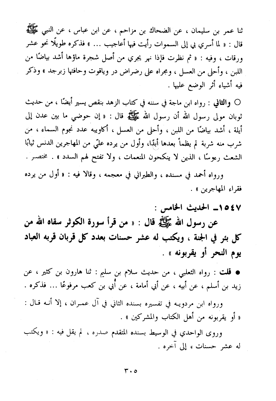 ثَنَا عمر بن سُلَيْمَان عَن الضَّحَّاك بن مُزَاحم عَن ابْن عَبَّاس عَن النَّبِي صَلَّى اللَّهُ عَلَيْهِ وَسَلَّم َ قَالَ لما أسرِي بِي إِلَى السَّمَوَات رَأَيْت فِيهَا أَعَاجِيب ... فَذكره طَويلا نَحْو عشر وَرَقَات وَفِيه ثمَّ نظرت فَإِذا نهر يجْرِي من أصل شَجَرَة مَاؤُهَا أَشد بَيَاضًا من اللَّبن وَأَحْلَى من الْعَسَل وَمَجْرَاهُ عَلَى رَضْرَاض در وَيَاقُوت وحافتها زبرجد وَذكر فِيهِ أَشْيَاء اثر الْوَضع عَلَيْهَا