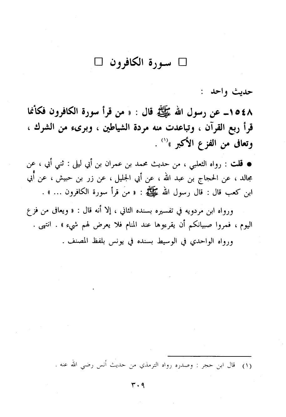 قلت رَوَاهُ الثَّعْلَبِيّ من حَدِيث مُحَمَّد بن عمرَان بن أبي لَيْلَى ثني أبي عَن مجَالد عَن الْحجَّاج بن عبد الله عَن أبي الْجَلِيل عَن زر بن حُبَيْش عَن أبي ابْن كَعْب قَالَ قَالَ رَسُول الله صَلَّى اللَّهُ عَلَيْهِ وَسَلَّم َ من قَرَأَ سُورَة الْكَافِرُونَ ...