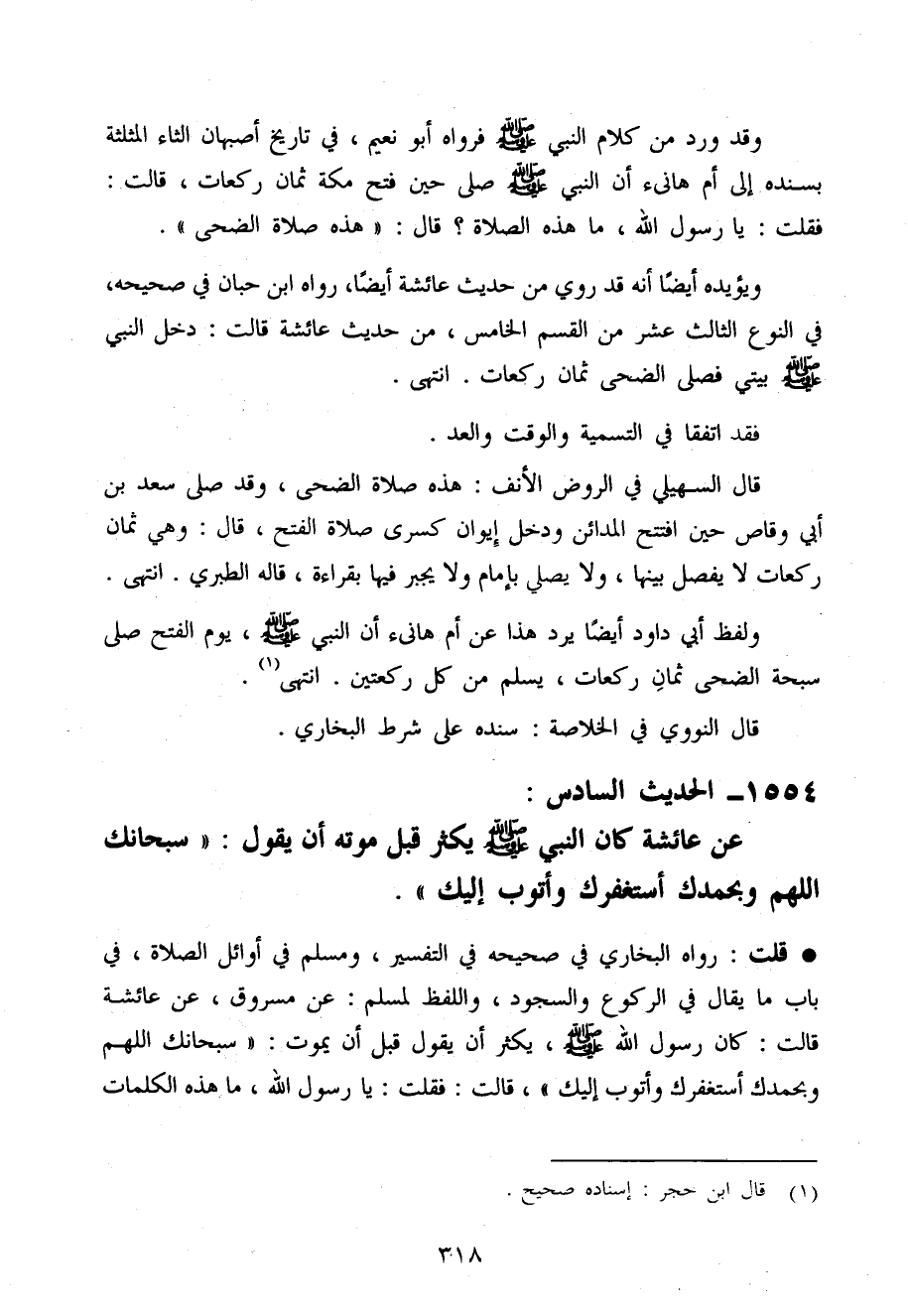 وَقد ورد من كَلَام النَّبِي صَلَّى اللَّهُ عَلَيْهِ وَسَلَّم َ فَرَوَاهُ أَبُو نعيم فِي تَارِيخ أَصْبَهَان الثَّاء الْمُثَلَّثَة بِسَنَدِهِ إِلَى أم هَانِئ أَن النَّبِي صَلَّى اللَّهُ عَلَيْهِ وَسَلَّم َ صَلَّى حِين فتح مَكَّة ثَمَان رَكْعَات قَالَت فَقلت يَا رَسُول الله مَا هَذِه الصَّلَاة قَالَ هَذِه صَلَاة الضُّحَى