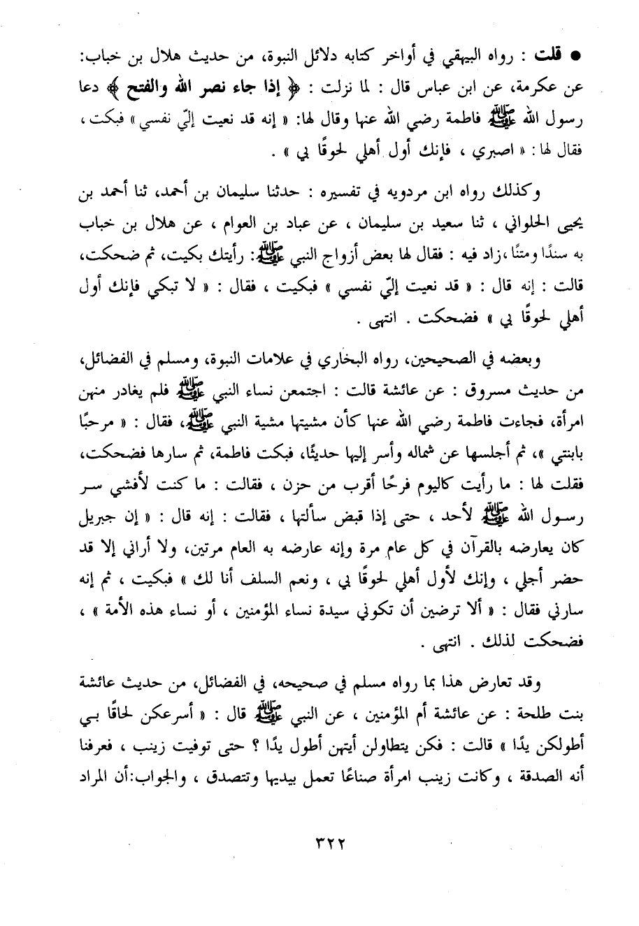 وَبَعضه فِي الصَّحِيحَيْنِ رَوَاهُ البُخَارِيّ فِي عَلَامَات النُّبُوَّة وَمُسلم فِي الْفَضَائِل من حَدِيث مَسْرُوق عَن عَائِشَة قَالَت اجْتَمعْنَ نسَاء النَّبِي صَلَّى اللَّهُ عَلَيْهِ وَسَلَّم َ فَلم يُغَادر مِنْهُنَّ امْرَأَة فَجَاءَت فَاطِمَة رَضِيَ اللَّهُ عَنْها كَأَن مشيتهَا مشْيَة النَّبِي صَلَّى اللَّهُ عَلَيْهِ وَسَلَّم َ فَقَالَ مرْحَبًا بِابْنَتي ثمَّ أَجْلِسهَا عَن شِمَاله وَأسر إِلَيْهَا حَدِيثا فَبَكَتْ فَاطِمَة ثمَّ سَارهَا فَضَحكت فَقلت لَهَا مَا رَأَيْت كَالْيَوْمِ فَرحا اقْربْ من حزن فَقَالَت مَا كنت لأفشي سر رَسُول الله صَلَّى اللَّهُ عَلَيْهِ وَسَلَّم َ لأحد حَتَّى إِذا قبض سَأَلتهَا فَقَالَت إِنَّه قَالَ إِن جِبْرِيل كَانَ يُعَارضهُ بِالْقُرْآنِ فِي كل عَام مرّة وَإنَّهُ عَارضه بِهِ الْعَام مرَّتَيْنِ وَلَا أَرَانِي إِلَّا قد حضر أَجلي وَإنَّك لأوّل أَهلِي لُحُوقا بِي وَنعم السّلف أَنا لَك فَبَكَيْت ثمَّ إِنَّه سَارَّنِي فَقَالَ أَلا ترْضينَ أَن تَكُونِي سيدة نسَاء الْمُؤمنِينَ أَو نسَاء هَذِه الْأمة فَضَحكت لذَلِك انْتَهَى