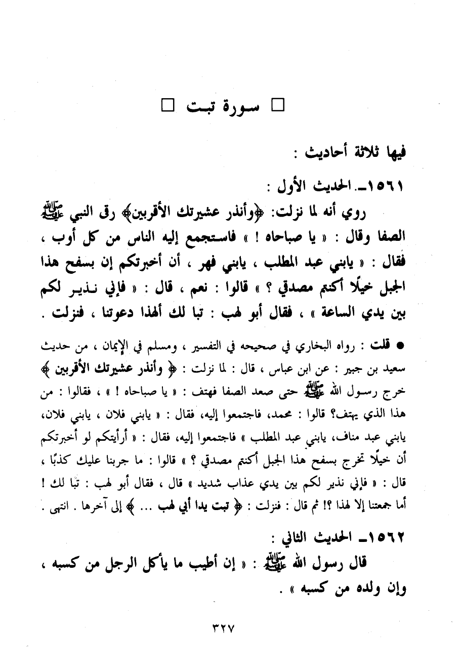 قلت رَوَاهُ البُخَارِيّ فِي صَحِيحه فِي التَّفْسِير وَمُسلم فِي الْإِيمَان من حَدِيث سعيد بن جُبَير عَن ابْن عَبَّاس قَالَ لما نزلت وانذر عشيرتك الْأَقْرَبين خرج رَسُول الله صَلَّى اللَّهُ عَلَيْهِ وَسَلَّم َ حَتَّى صعد الصَّفَا فَهَتَفَ يَا صَبَاحَاه فَقَالُوا من هَذَا الَّذِي يَهْتِف قَالُوا مُحَمَّد فَاجْتمعُوا إِلَيْهِ فَقَالَ يَا بني فلَان يَا بني فلَان يَا بني عبد منَاف يَا بني عبد الْمطلب فَاجْتمعُوا إِلَيْهِ فَقَالَ أَرَأَيْتكُم لَو أَخْبَرتكُم أَن خيلا تخرج بسفح هَذَا الْجَبَل أَكُنْتُم مصدقي قَالُوا مَا جربنَا عَلَيْك كذبا قَالَ فَإِنِّي نَذِير لكم بَين يَدي عَذَاب شَدِيد قَالَ فَقَالَ أَبُو لَهب تَبًّا لَك أما جمعتنَا إِلَّا لهَذَا ثمَّ قَالَ فَنزلت تبت يدا أبي لَهب ... إِلَى آخرهَا انْتَهَى