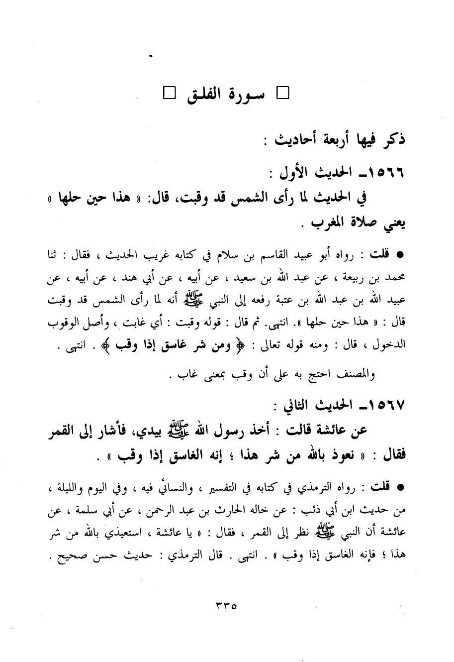 قلت رَوَاهُ التِّرْمِذِيّ فِي كِتَابه فِي التَّفْسِير وَالنَّسَائِيّ فِيهِ وَفِي الْيَوْم وَاللَّيْلَة من حَدِيث ابْن أبي ذِئْب عَن خَاله الْحَارِث بن عبد الرَّحْمَن عَن أبي سَلمَة عَن عَائِشَة أَن النَّبِي صَلَّى اللَّهُ عَلَيْهِ وَسَلَّم َ نظر إِلَى الْقَمَر فَقَالَ يَا عَائِشَة اسْتَعِيذِي بِاللَّه من شَرّ هَذَا فَإِنَّهُ الْغَاسِق إِذا وَقب انْتَهَى قَالَ التِّرْمِذِيّ حَدِيث حسن صَحِيح
