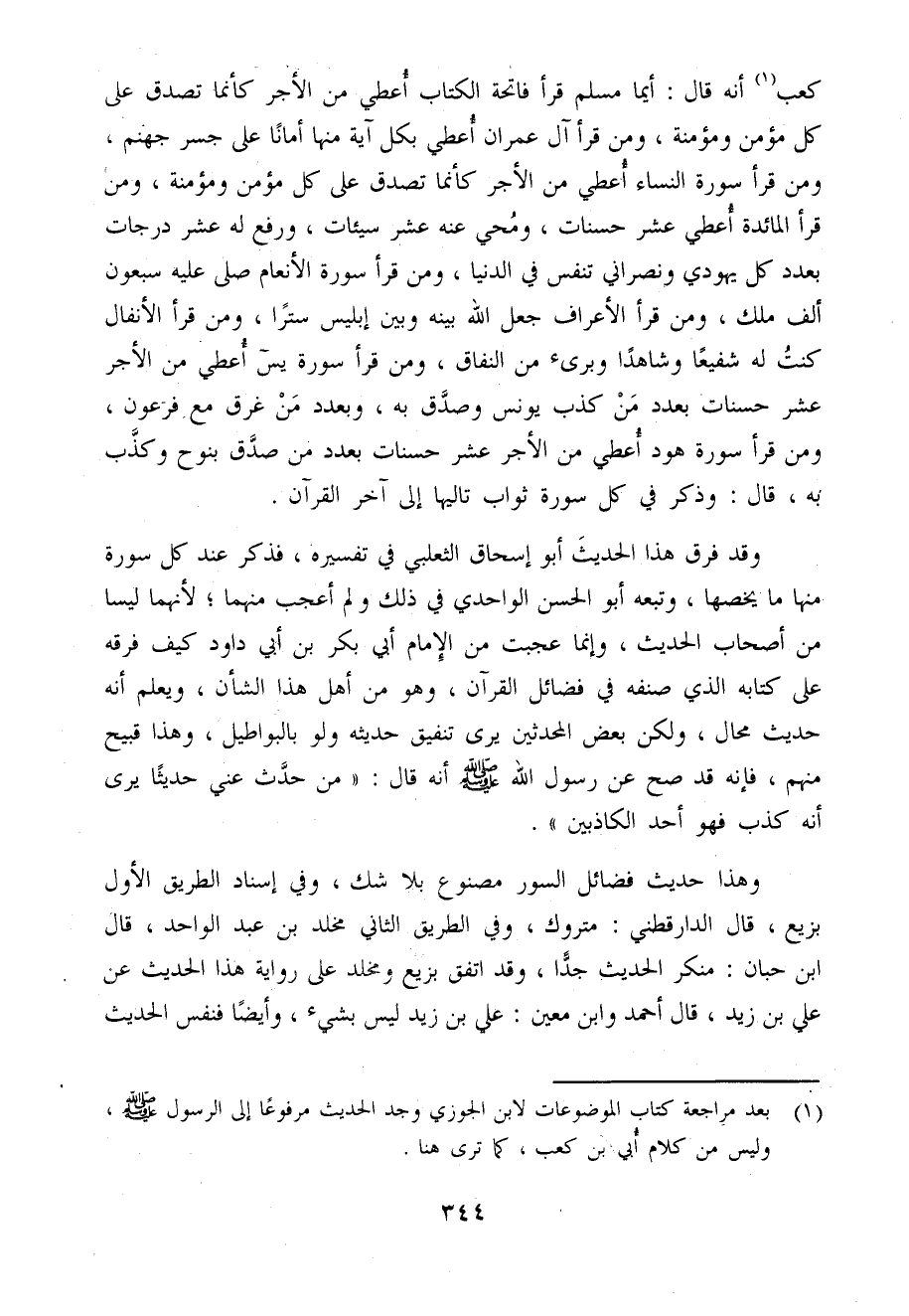 وَقد فرق هَذَا الحَدِيث أَبُو إِسْحَاق الثَّعْلَبِيّ فِي تَفْسِيره فَذكر عِنْد كل سُورَة مِنْهَا مَا يَخُصهَا وَتَبعهُ أَبُو الْحسن الواحدي فِي ذَلِك وَلم أعجب مِنْهُمَا لِأَنَّهُمَا ليسَا من أَصْحَاب الحَدِيث وَإِنَّمَا عجبت من الإِمَام أبي بكر بن أبي دَاوُد كَيفَ فرقه عَلَى كِتَابه الَّذِي صنفه فِي فَضَائِل الْقُرْآن وَهُوَ من أهل هَذَا الشَّأْن وَيعلم أَنه حَدِيث محَال وَلَكِن بعض الْمُحدثين يرَى تَنْفِيقِ حَدِيثه وَلَو بِالْبَوَاطِيل وَهَذَا قَبِيح مِنْهُم فَإِنَّهُ قد صَحَّ عَن رَسُول الله صَلَّى اللَّهُ عَلَيْهِ وَسَلَّم َ أَنه قَالَ من حدث عني حَدِيثا يرَى أَنه كذب فَهُوَ أحد الْكَاذِبين