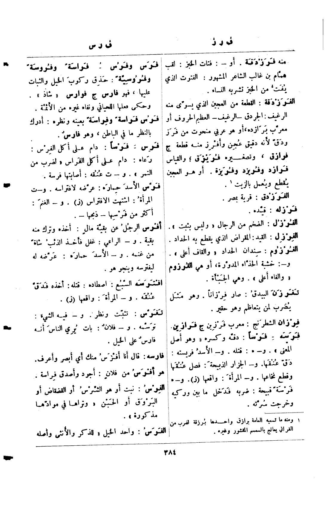 فرس وفرس- فراسة وفروسة وفروسية: حذق ركوب الخيل والثبات عليها، فهو فارس ج فوارس "شاذ". وحكى فعلها اللحياني ونفاه غيره من الأئمة.