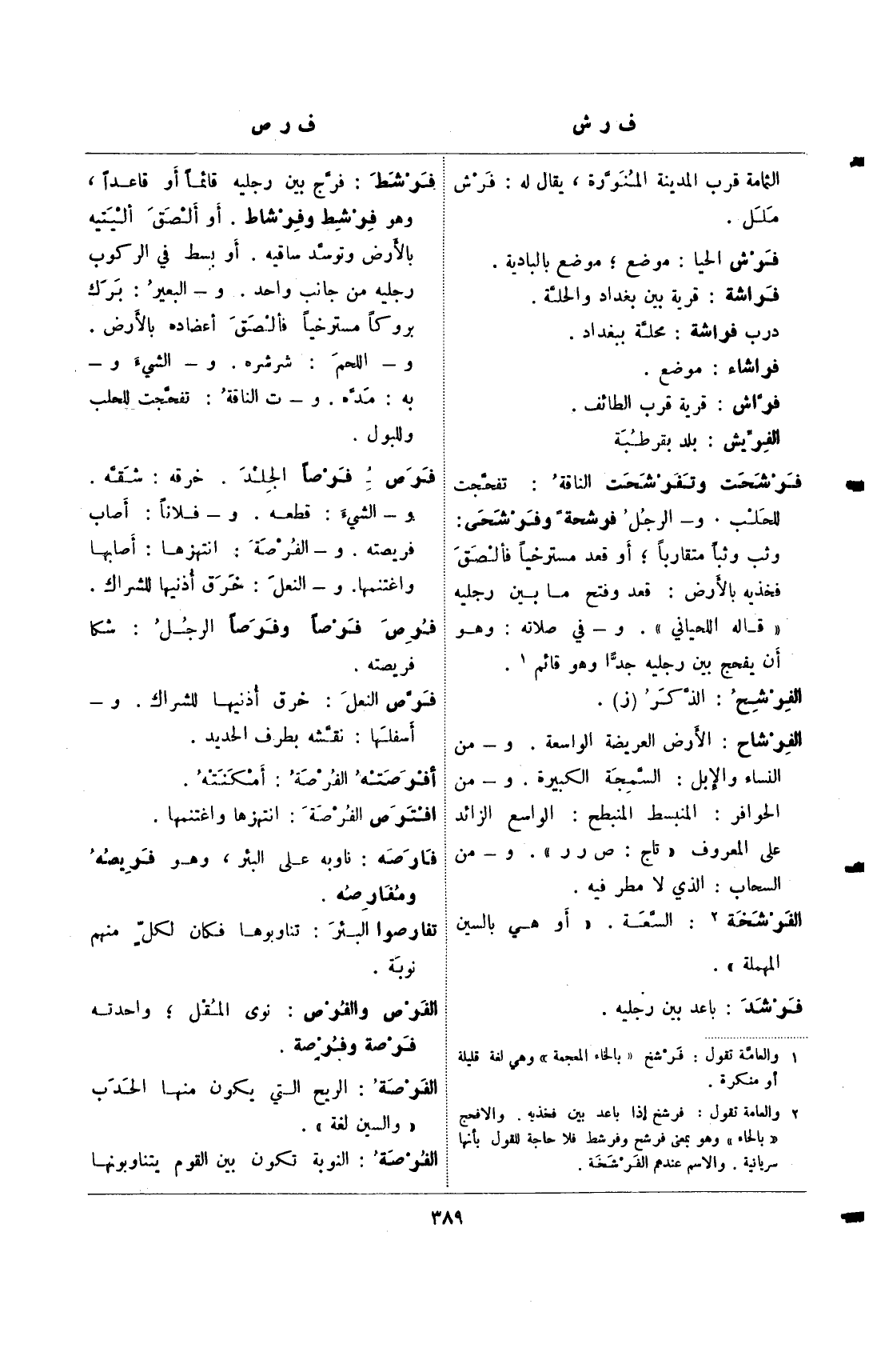 فرشط: فرج بين رجليه قائما أو قاعدا، وهو فرشط وفرشاط. أو ألصق أليتيه بالأرض وتوسد ساقيه. أو بسط في الركوب رجليه من جانب واحد. و- البعير: برك بروكا مسترخيا فألصق أعضاده بالأرض. و- اللحم: شرشره. و- الشيء و- به: مده. و- ت الناقة: تفحجت للحلب وللبول.