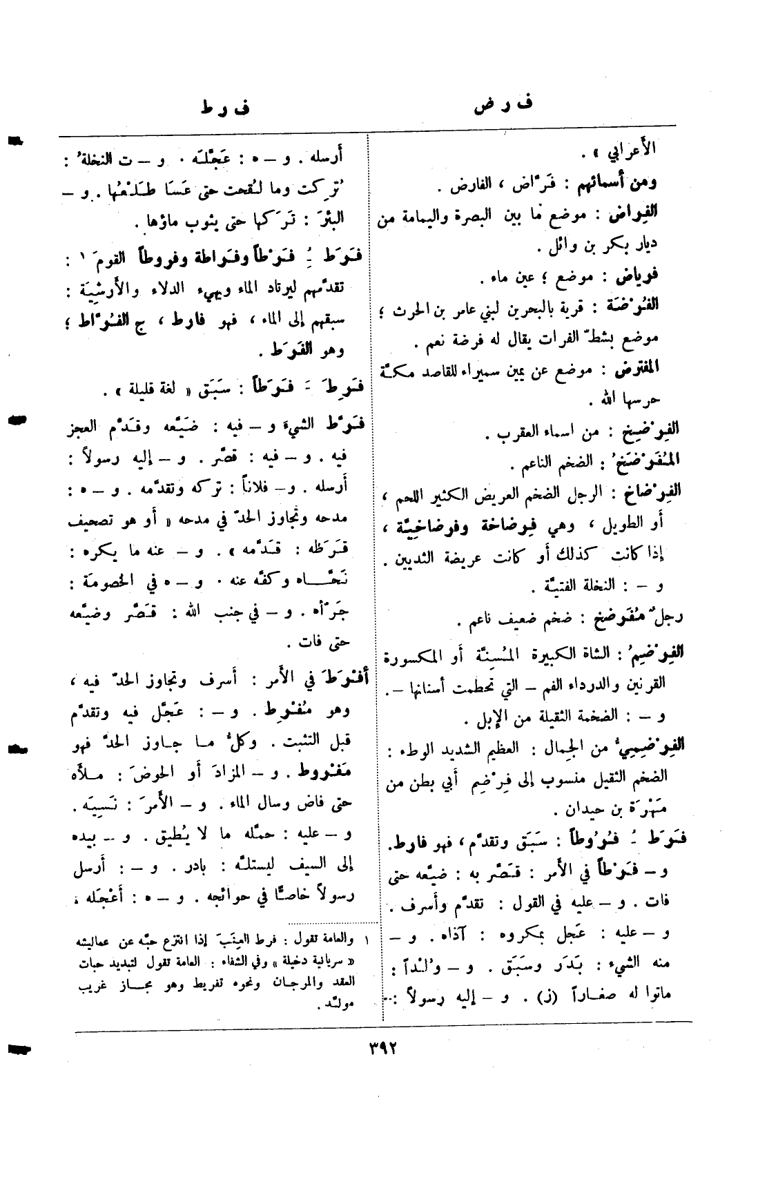 فرط- فرطا وفراطة وفروطا القوم (¬1): تقدمهم ليرتاد الماء ويهيء الدلاء والأرشية: سبقهم إلى الماء، فهو فارط، ج الفراط؛ وهو الفرط.