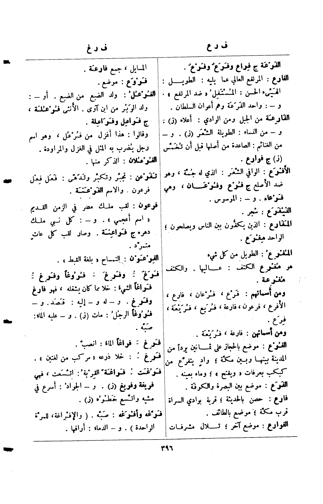 الفارع: المرتفع العالي عما يليه: الطويل: الهيئ الحسن: المستفل "ضد المرتفع". و-: واحد الفرعة وهم أعوان السلطان.