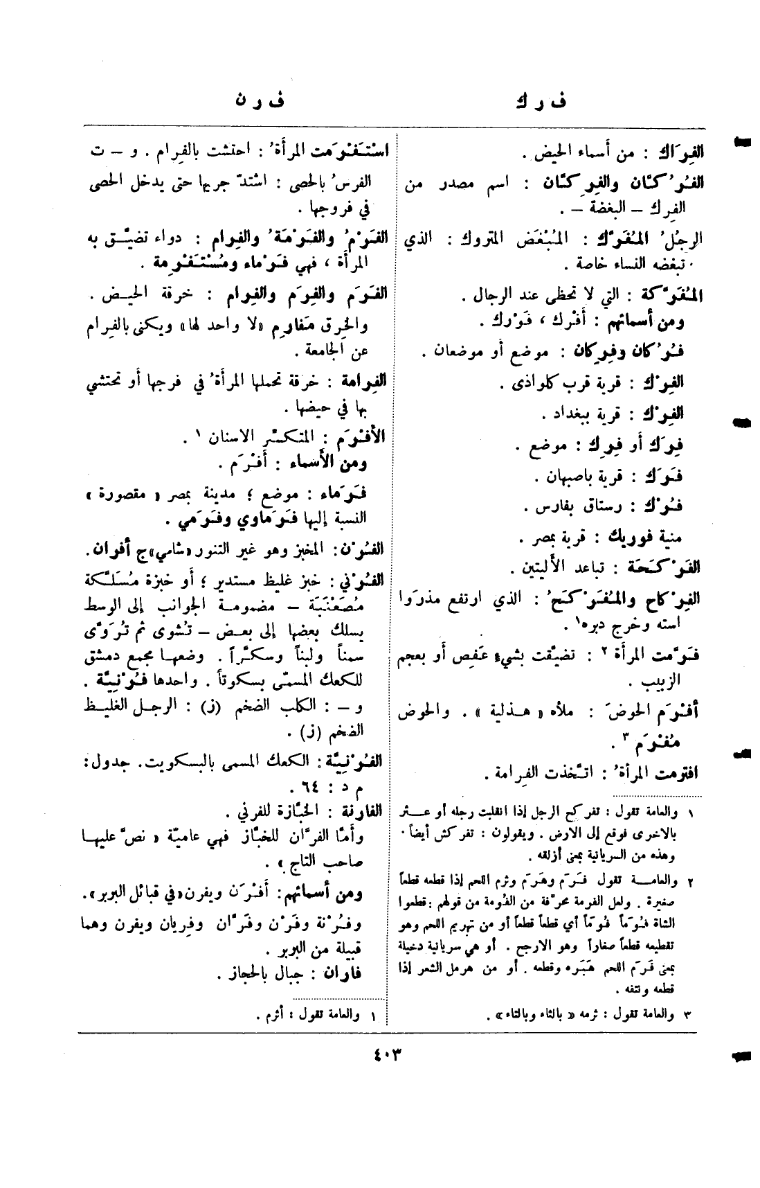 الفرم والفرم والفرام: خرقة الحيض. والخرق مفارم "لا واحد لها" ويكنى بالفرام عن الجامعة.