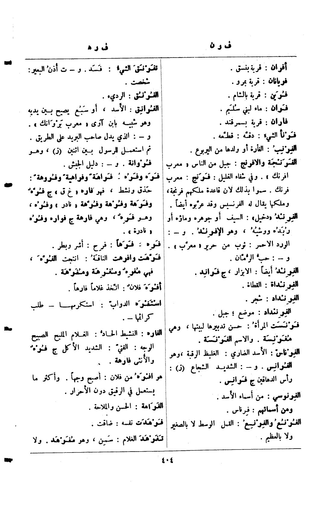 الفرناس: الأسد الضاري: الغليظ الرقبة، وهو الفرانس. و-: الشديد الشجاع (ز): رأس الدهاقين ج فرانس.