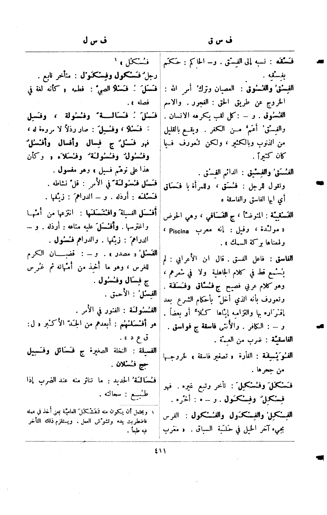 فسل- فسالة وفسولة، وفسل فسلا، وفسل: صار رذلا لا مروءة له، فهو فسل ج فسال وأفسال وأفسل وفسول وفسولة وفسلاء "وكان هذا على توهم فسيل" وهو مفسول.