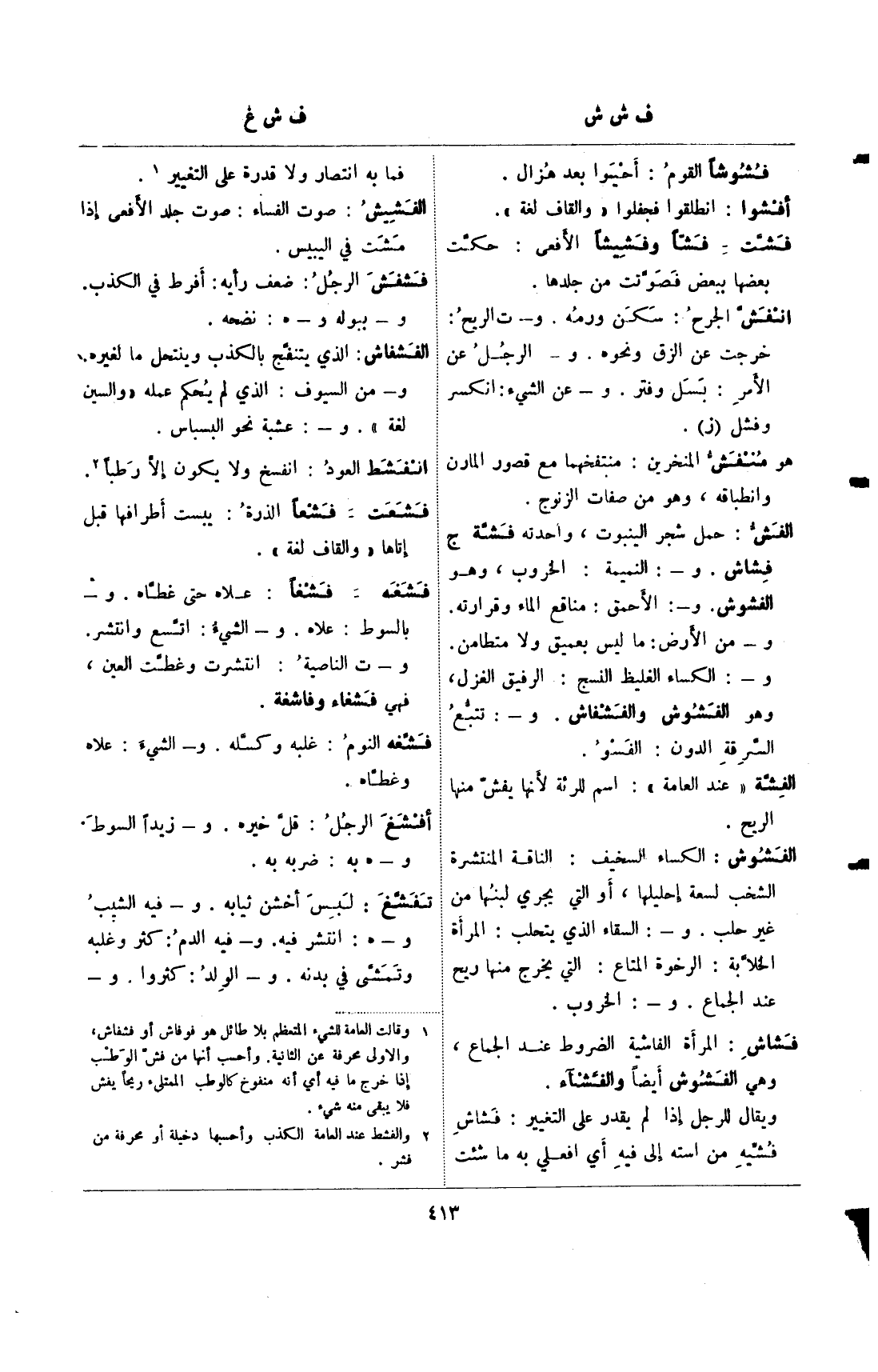 (¬1) وقالت العامة للشيء المتعظم بلا طائل هو فوفاش أو فشفاش، والأولى وحرفة عن الثانية. وأحسب أنها من فش الوطب إذا خرج ما فيه أي أنه منفوخ كالوطب الممتلئ ريحا يفش فلا يبقى منه شيء.