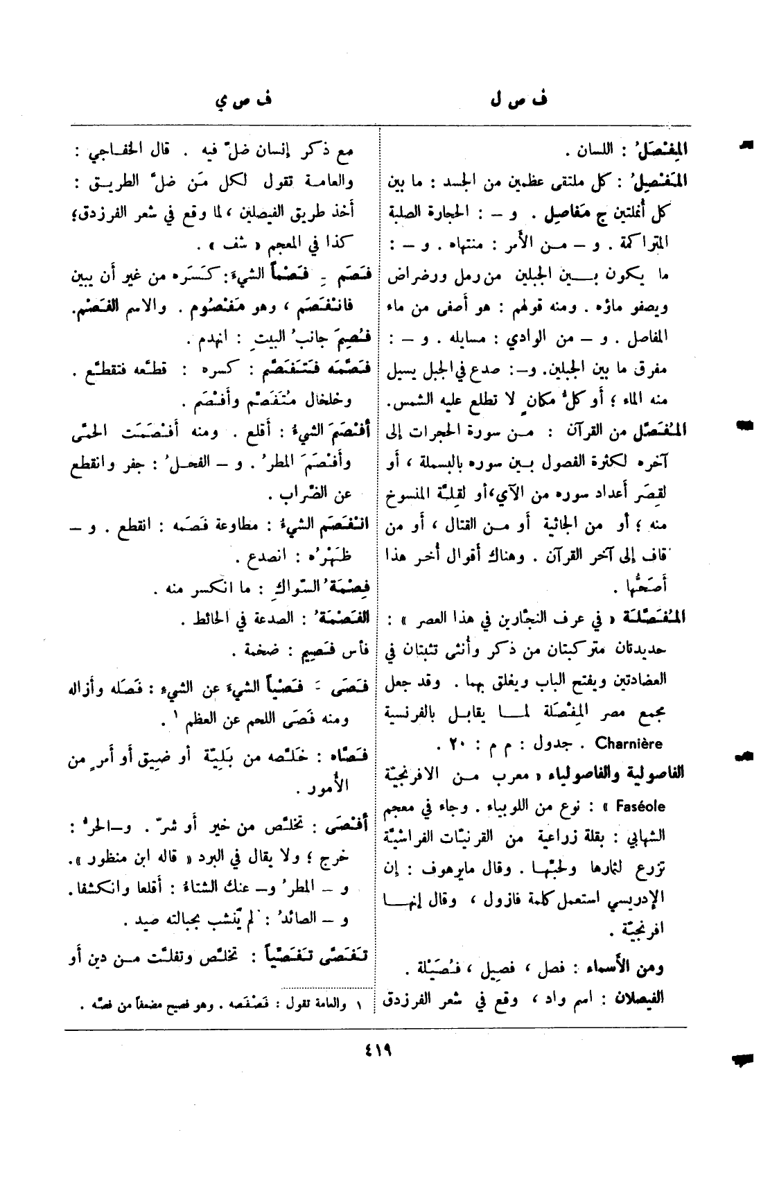 الفاصولية والفاصولياء" معرب من الافرنجية faseole": نوع من اللوبياء. وجاء في معجم الشهابي: بقلة زراعية من القرنيات الفراشية تزرع لثمارها ولحبها. وقال مايرهوف: إن الإدريسي استعمل كلمة فازول، وقال إنها افرنجية.