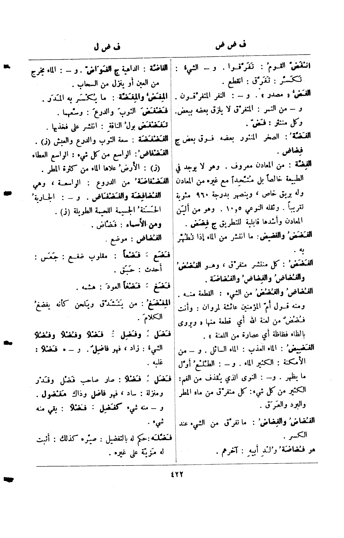 الفض "مصدر". و-: النفر المتفرقون. و- من التمر: المتفرق لا يلزق بعضه ببعض. وكل متنثر: فض.
