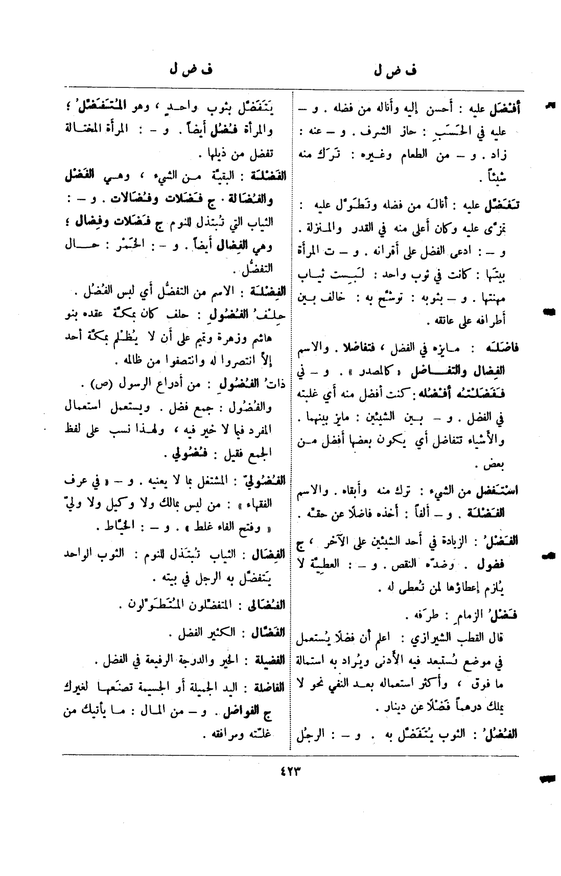 الفضل: الثوب يتفضل به. و-: الرجل يتفضل بثوب واحد، وهو المتفضل؛ والمرأة فضل أيضا. و-: المرأة المختالة تفضل من ذيلها.
