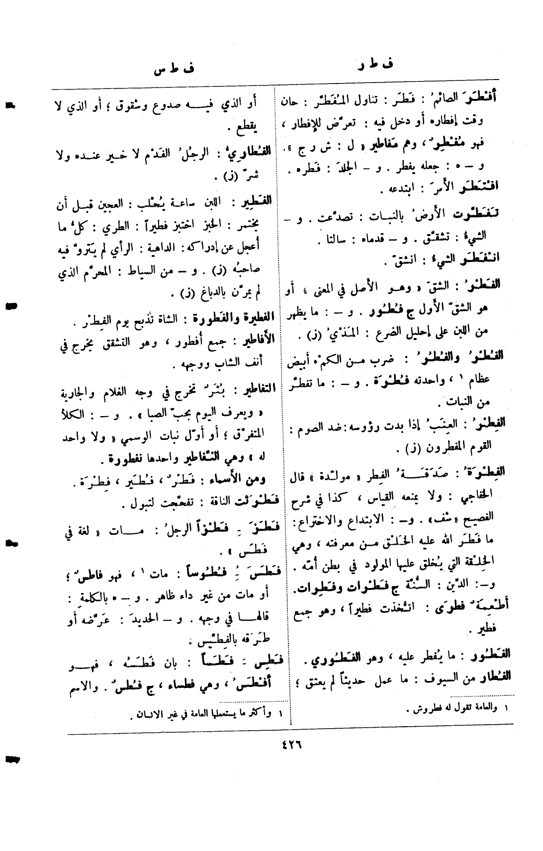 الفطير: اللبن ساعة يحلب: العجين قبل أن يختمر: الخبز اختبز فطيرا: الطري: كل ما أعجل عن إدراكه: الداهية: الرأي لم يترو فيه صاحبه (ز). و- من السياط: المحرم الذي لم يمر ن بالدباغ (ز).