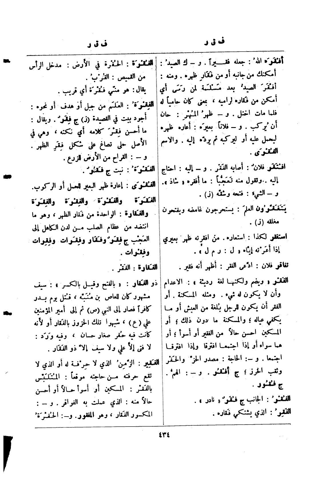 أفقره الله: جعله فقيرا. و- ك الصيد: أمكنك من جانبه أو من فقار ظهره. ومنه: أفقر الصيد بعد مسلمة لمن رمى أي أمكن من فقاره لراميه، بمعنى كان حاميا له فلما مات اختل. و- ظهر المهر: حان أن يركب. و- فلانا بعيره: أعاره ظهره ليحمل علي أو ليركبه ثم يرده إليه. والاسم الفقرى. افتقر فلان: أصابه الفقر. و- إليه: احتاج إليه. وتقول منه تعجبا: ما أفقره "شاذ". و- الشيء: فتحه وشقه (ز).