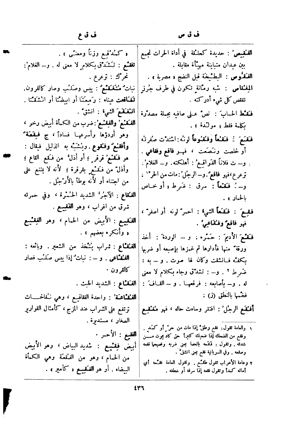 (¬1) والعامة تقول: فقع وطق إذا مات من حر أو كمد. وفقع من الضحك إذا ضحك كثيرا حتى يكاد يموت من شدته. وتقول: فقمه بالعصا بمعنى ضربه وفصيحها قفعه وصقعه. وفي السريانية فقع بمعنى الشق.