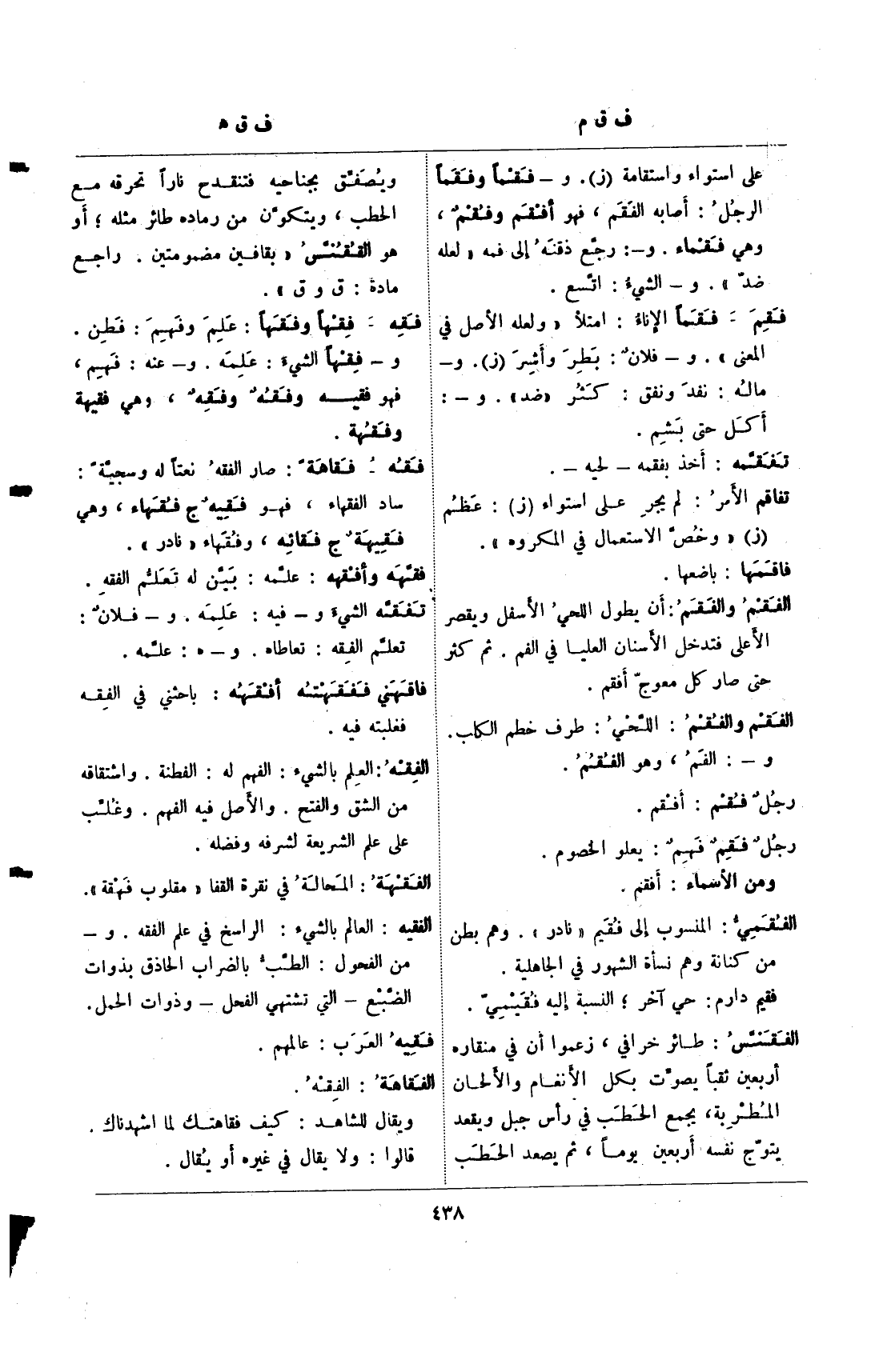 فقه- فقها وفقها: علم وفهم: فطن. و- فقها الشيء: علمه. و- عنه: فهم، فهو فقيه وفقه وفقه، وهي فقيهة وفقهة.