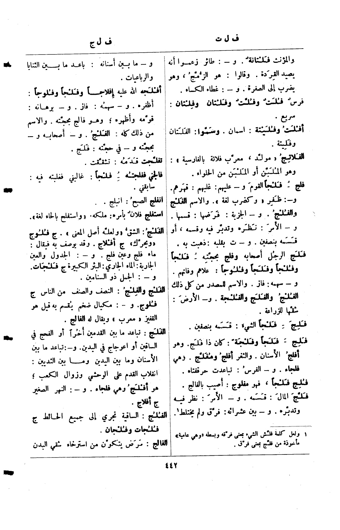الفلج: الشق "ولعله أصل المعنى". ج فلوج "ويحرك" ج أفلاج. وقد يوصف به فيقال: ماء فلج وعين فلج. و-: الجدول العين الجارية: الماء الجاري: البئر الكبيرة ج فلجات. و-: الجمل ذو السنامين.