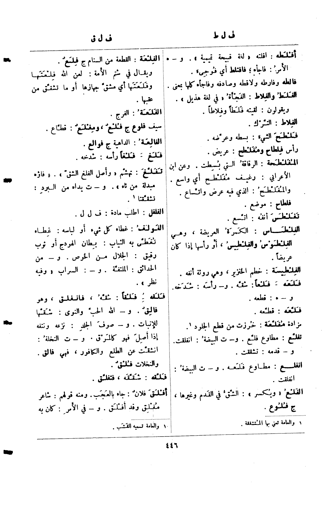 فلقه- فلقا: شقه، فانفلق، وهو فالق: و- الله الحب والنوى: شقها للإنبات. و- صوف الجلد: نزعه ونتفه إذا أصل فهو كالمرق. و- ت النخلة: انشقت عن الطلع والكافور، فهي فالق. والنخلات فلق.