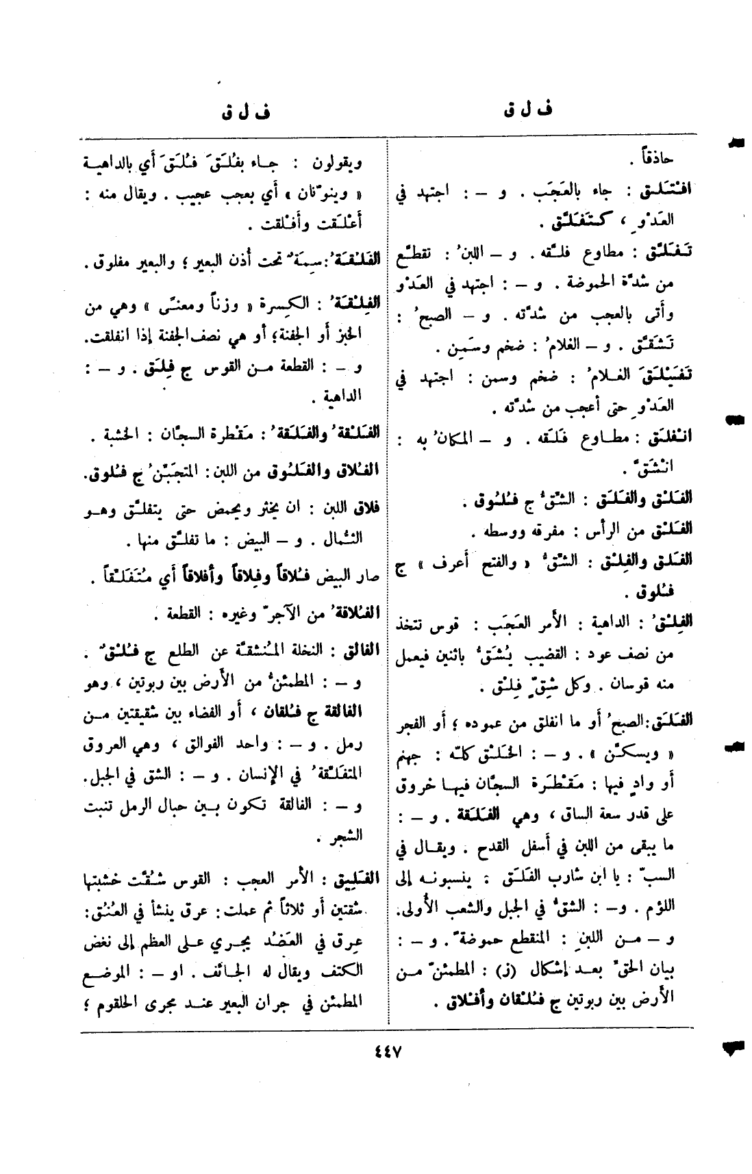 الفليق: الأمر العجب: القوس شقت خشبتها شقتين أو ثلاثا ث عملت: عرق ينشأ في العنق: عرق في العضد يجري على العظم إلى نغض الكتف ويقال له الجائف. أو-: الموضع المطمئن في جران البعير عند مجرى الحلقوم؛