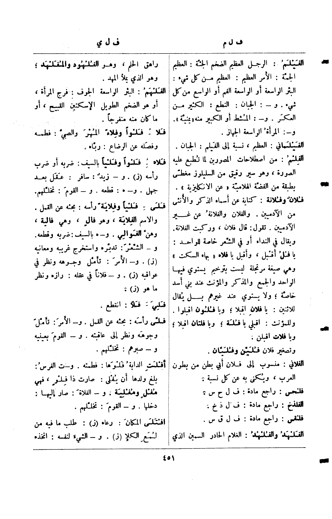 فلاه- فلوا وفليا بالسيف: ضربه أو ضرب رأسه (ز). و- زيد: سافر: عقل بعد جهل. و- هـ: قطعه. و- القوم: تخللهم.