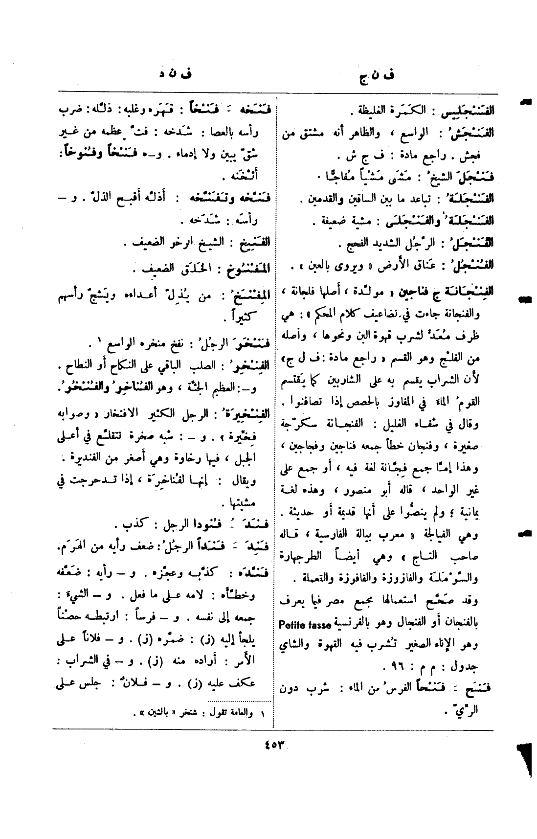 وقد صحح استعمالها مجمع مصر فيما يعرف بالفنجان أو الفنجال وهو بالفرنسية petite tasse وهو الإناء الصغير تشرب فيه القهوة والشاء جدول: م م: 96.