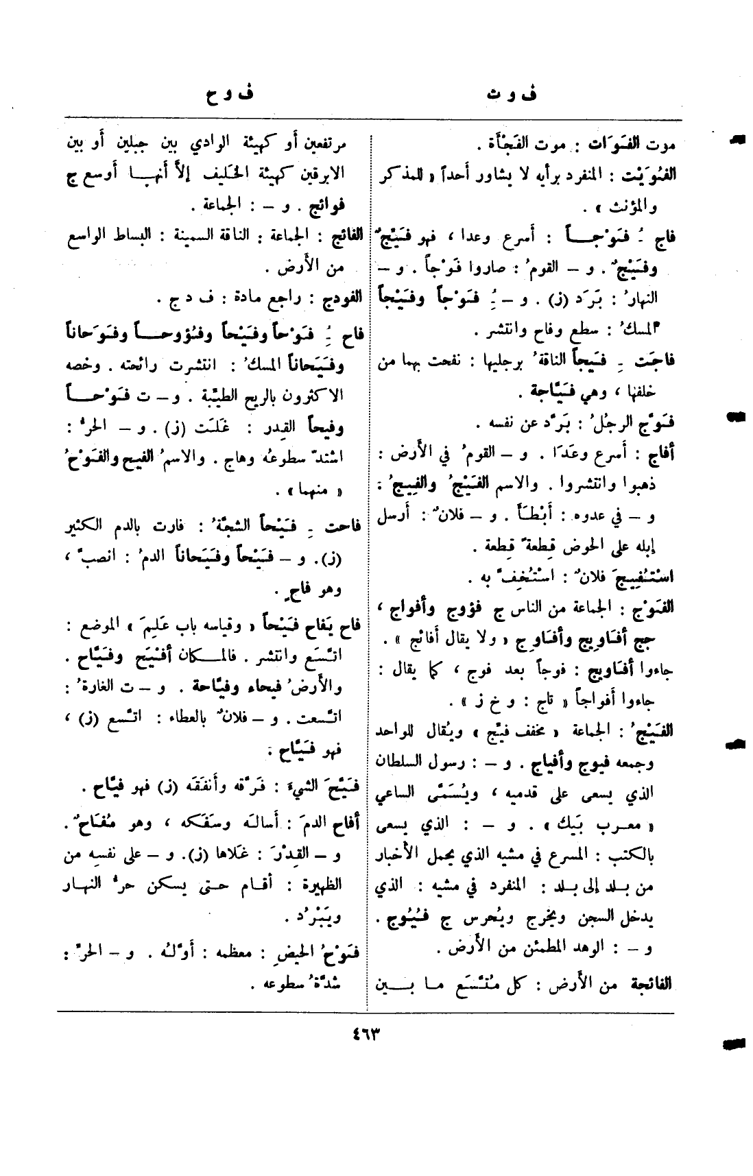 فاح- فوحا وفيحا وفؤوحا وفوحانا وفيحانا المسك: انتشرت راحئته. وخصه الاكثرون بالريح الطيبة. و- ت فوحا وفيحا القدر: غلت (ز). و- الحر: اشتد سطوعه وهاج. والاسم الفيح والفوح "منهما".