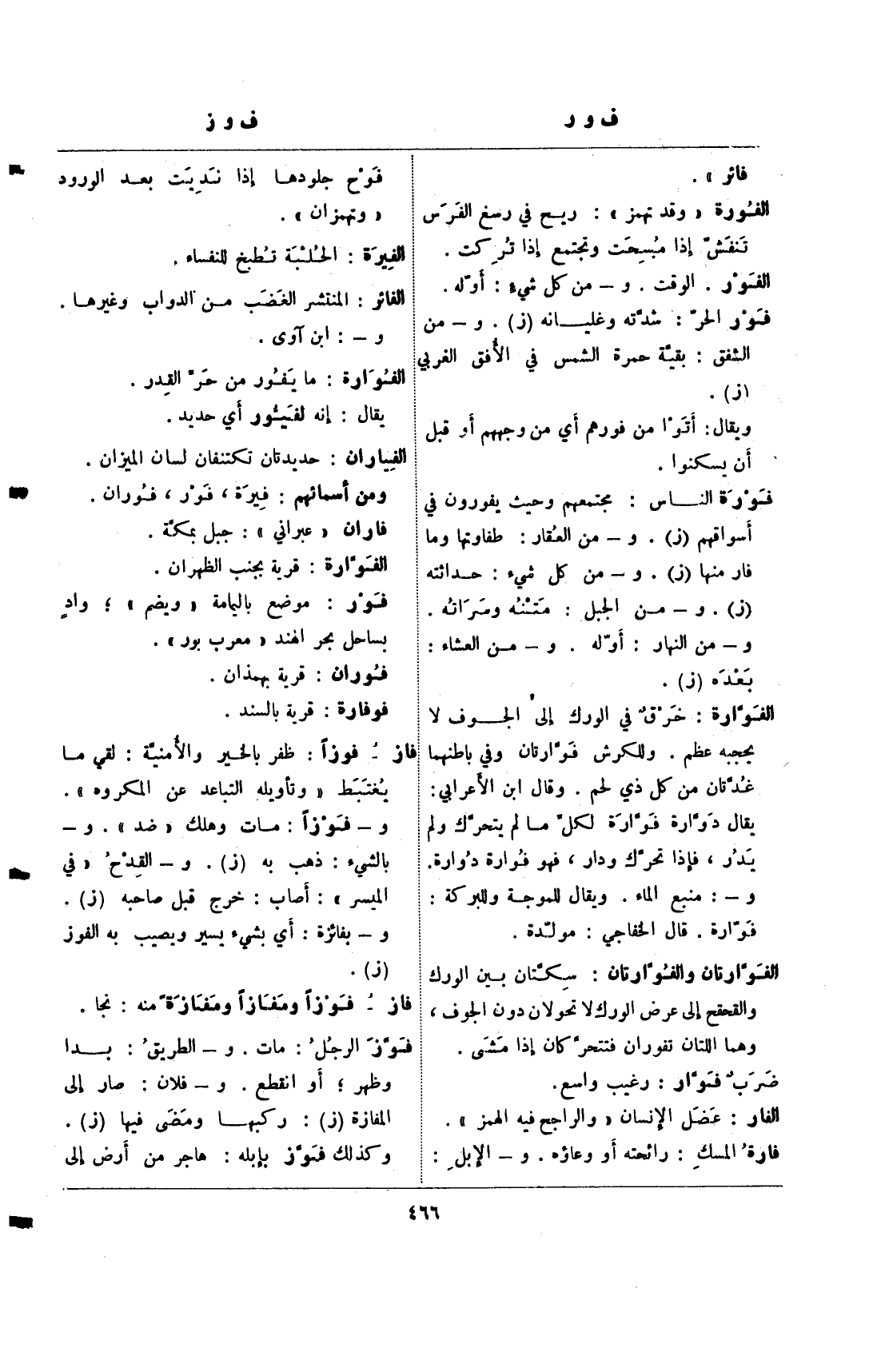 فوز الرجل: مات. و- الطريق: بدا وظهر؛ أو انقطع. و- فلان: صار إلى المفازة (ز): ركبها ومضى فيها (ز). وكذلك فوز بإبله: هاجر من أرض إلى
