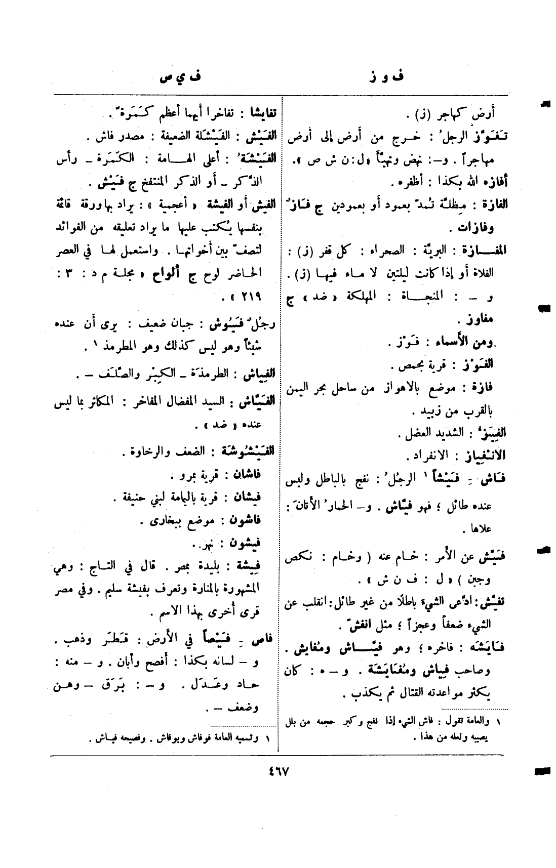 فاش- فيشا (¬1) الرجل: نفج بالباطل وليس عنده طائل؛ فهو فياش. و- الحمار الأتان: علاها.