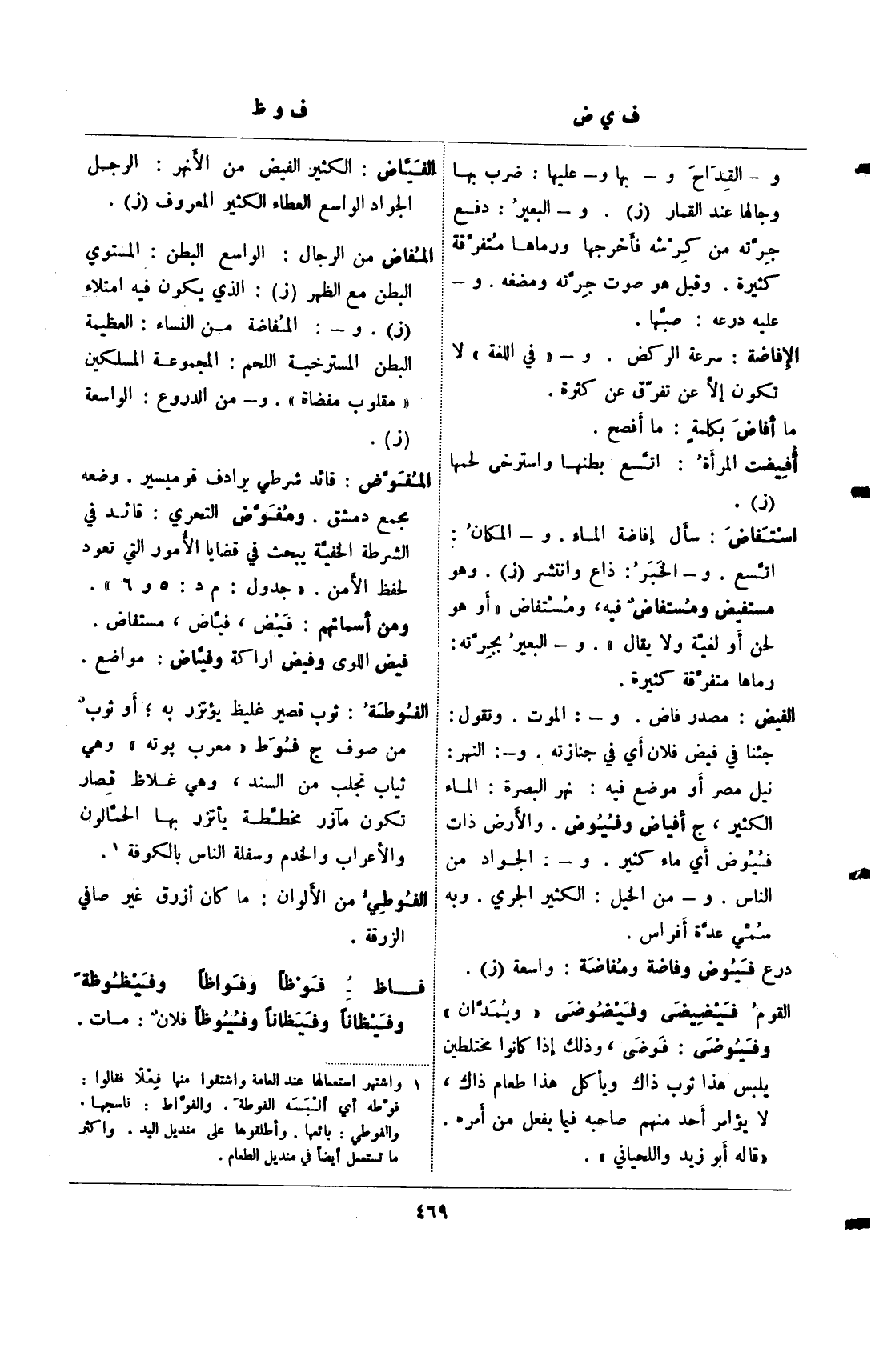 المفاض منا لرجال: الواسع البطن: المستوي البطن مع الظهر (ز): الذي يكون فيه امتلاء (ز). و-: المفاضة من النساء: العظيمة البطن المسترخية اللحم: المجموعة المسلكين "مقلوب مفاضة". و- من الدروع: الواسعة (ز).