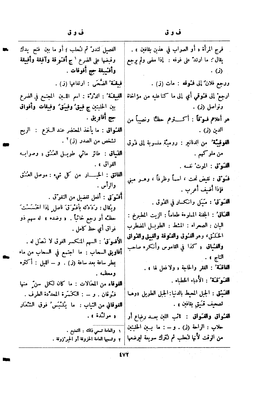 الفاق: الجفنة المملوءة طعاما: الزيت المطبوخ: البان: الصحراء: المشط: الطويل المضطرب الخلق، وهو الفوق والفوقة والفيق والفواق والفياق "كذا في القاموس وأنكره صاحب التاج".