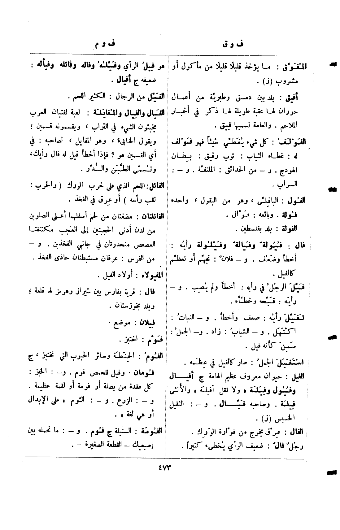 الفيل: حيوان معروف عظيم الهامة ج أفيال وفيول وفيلة "ولا تقل أفيلة" والأنثى فيلة. وصاحبه فيال. و-: الثقيل الخسيس (ز).