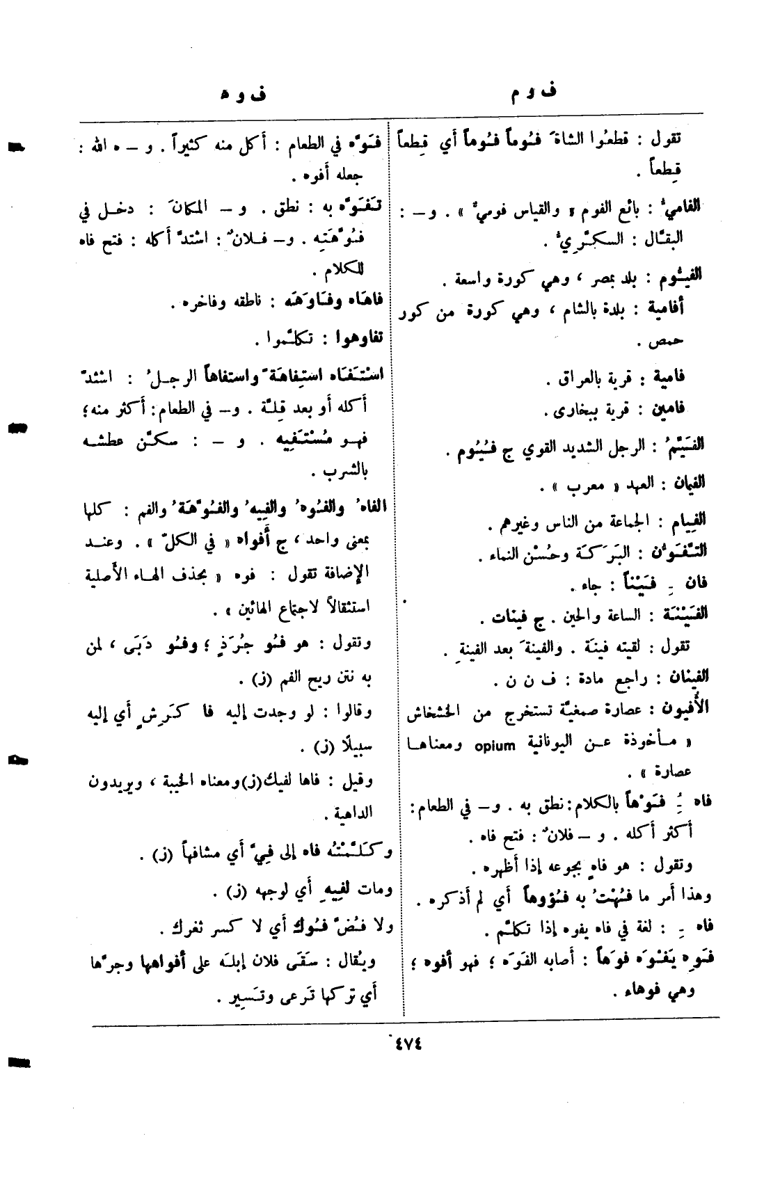 الفاه والفوه والفيه والفوهة والفم: كلها بمعنى واحد، ج أفواه "في الكل". وعند الإضافة تقول: فوه "بحذف الهاء الأصلية استثقالا لاجتماع الهائين".