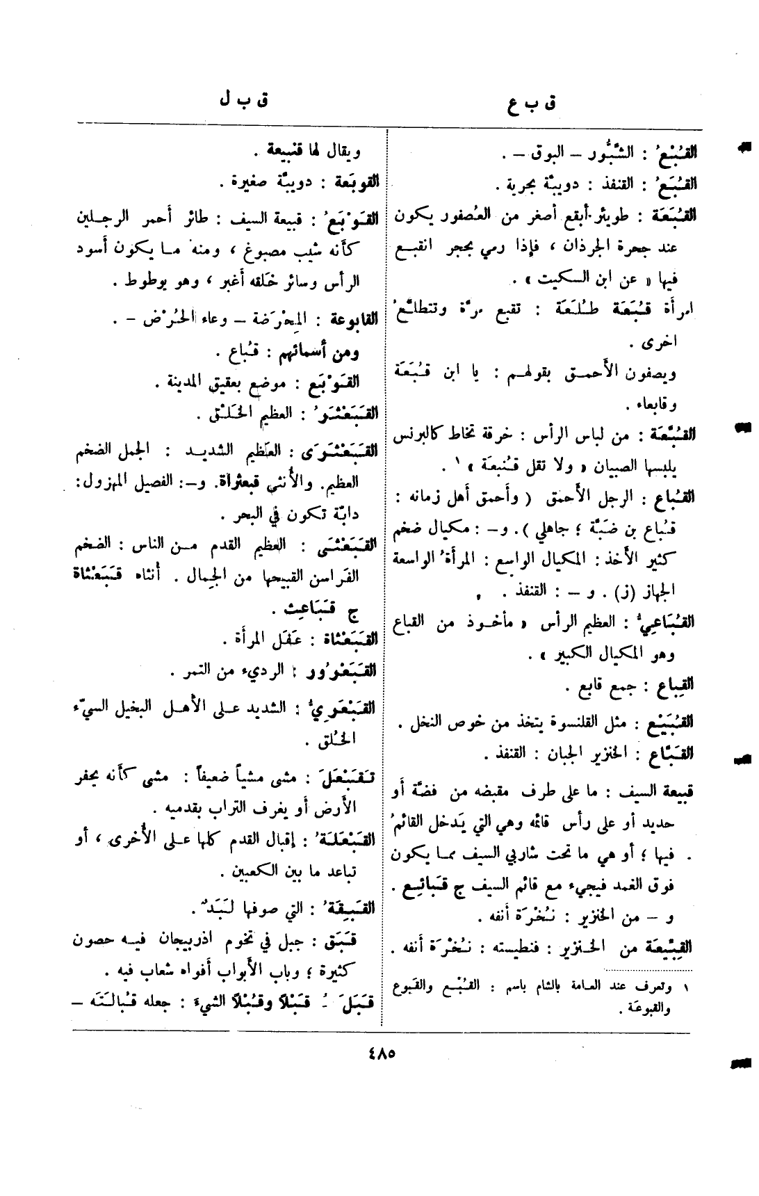 القباع: الرجل الأحمق (وأحمق أهل زمانه: قباع بن ضبة؛ جاهلي). و-: مكيال ضخم كثير الأخذ: المكيال الواسع: المرأة الواسعة الجهاز (ز). و-: القنفذ.