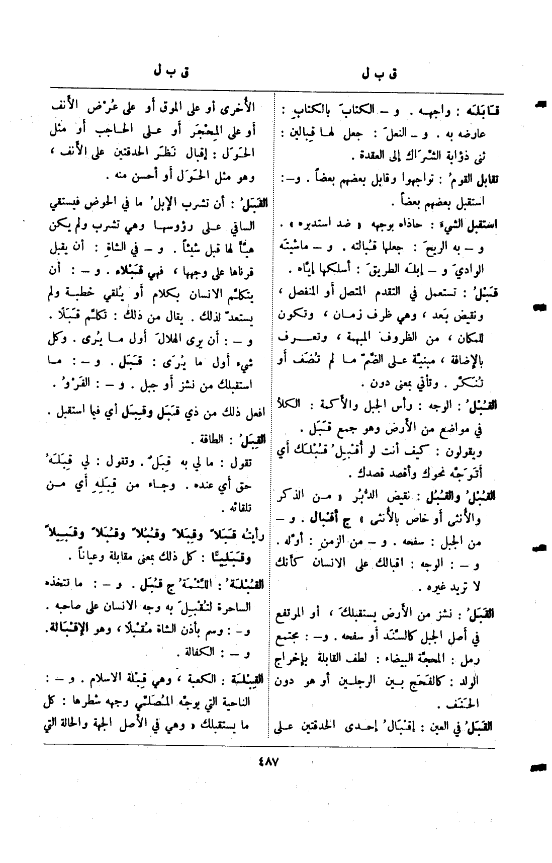 القبل: أن تشرب الإبل ما في الحوض فيستقي الساقي على رؤوسها وهي تشرب ولم يكن هيأ لها قبل شيئا. و-: في الشاة: أن يقبل قرناها على وجهها، فهي قبلاء. و-: أن يتكلم الإنسان بكلام أو يلقي خطبة ولم يستعد لذلك. يقال من ذلك: تكلم قبلا. و-: أن يرى الهلال أول ما يرى. وكل شيء أول ما يرى: قبل. و-: ما استقبلك من نشز أو جبل. و-: الفرو.