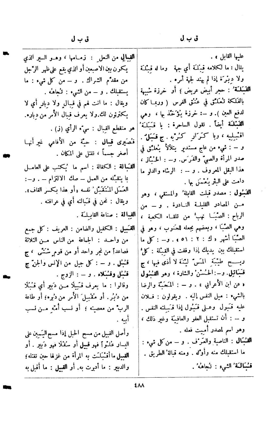 القبلة: حجر أبيض عريض؛ أو خرزة شبيهة بالفلكة تعلق في عنق الفرس (وربما كان لدفع العين). و-: خرزة يؤخذ بها، وهي القبلة أيضا. تقول الساحرة: يا قبلة اقبليه، ويا كرار كريه. ج قبل. و-: شيء من عاج مستدير يتلألأ يعلق في صدر المرأة والصبي والفرس. و-: الخباز، هذا البقل المعروف. و-: الرشاء والدلو ما دامت على البئر يعمل بها.