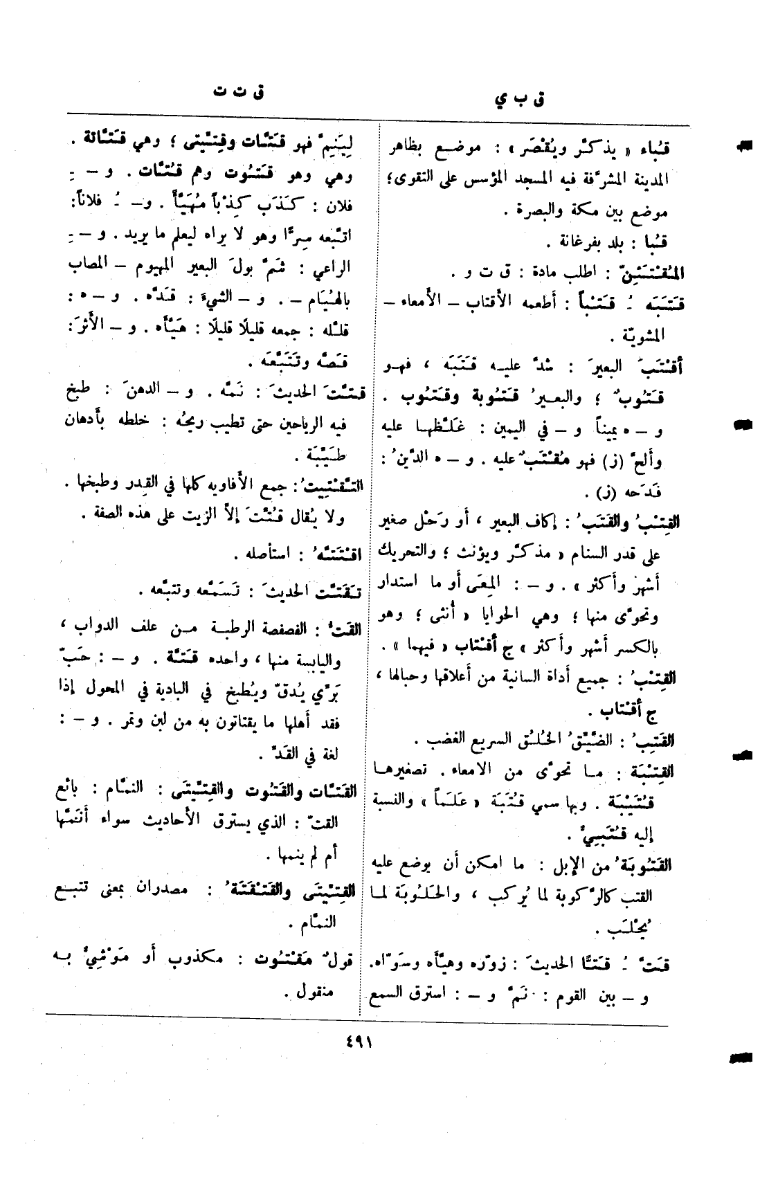 قت- قتا الحديث: زوره وهيأه وسواه. و- بين القوم: نم. و-: استرق السمع لينم فهو قتات وقتيتى؛ وهي قتاتة. وهي وهو قتوت وهم قتات. و- فلان: كذب كذبا مهيأ. و- فلانا: اتبعه سرا وهو لا يراه ليعلم ما يريد. و- الراعي: شم بول البعير المهيوم- المصاب بالهيام-. و- الشيء: قده. و- هـ: قلله: جمعه قليلا قليلا: هيأه. و- الأثر: قصه وتتبعه.
