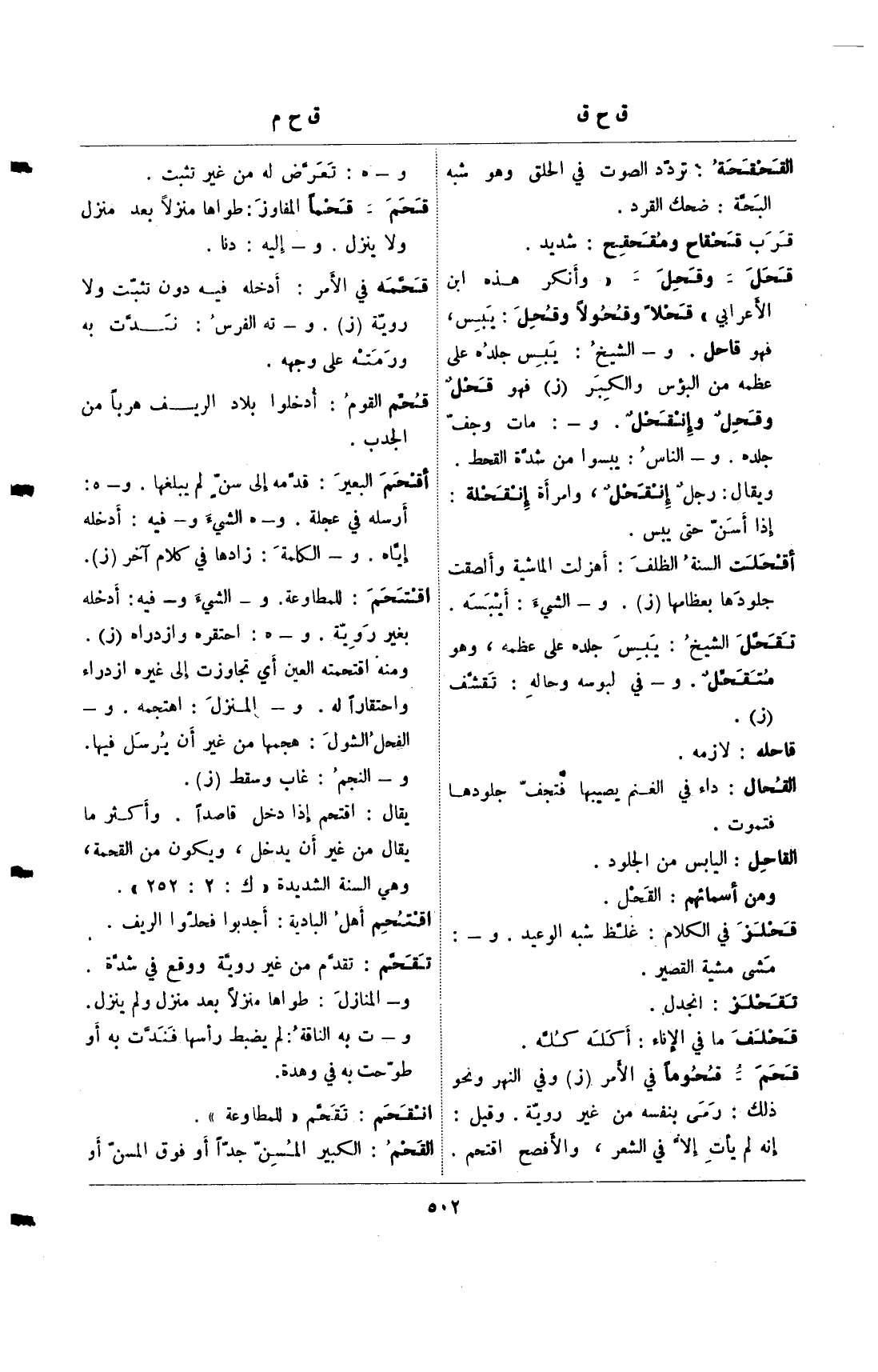 قحم- قحوما في الأمر (ز) وفي النهر ونحو ذلك: رمى بنفسه من غير روية. وقيل: إنه لم يأت إلا في الشعر، والأفصح اقتحم. و- هـ: تعرض له من غير تثبت.