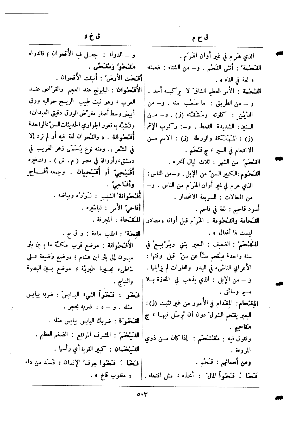 القحوم: الكبير السن من الإبل. و- من الناس: الذي هرم في غير أوان الهرم من الناس. و- من المحالات: السريعة الانحدار.