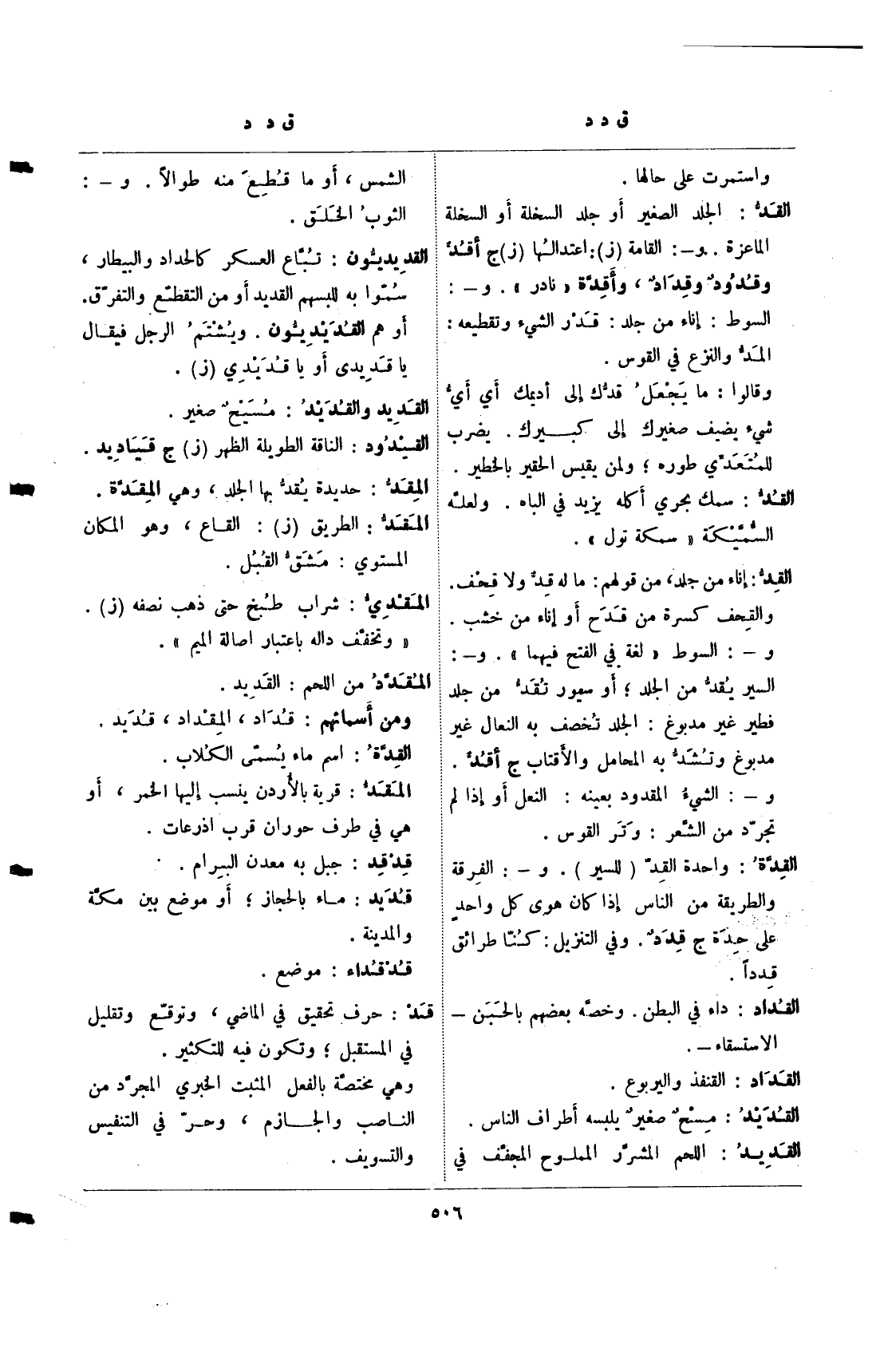 القد: إناء من جلد، من قولهم: ما له قد ولا قحف. والقحف كسرة من قدح أو إناء من خشب. و-: السوط "لغة في الفتح فيهما". و-: السير يقد من الجلد؛ أو سيور تقد من جلد فطير غير مدبوغ: الجلد تخصف به النعال غير مدبوغ وتشد به المحامل والأقتاب ج أقد. و-: الشيء المقدود بعينه: النعل أو إذا لم تجرد من الشعر: وتر القوس.