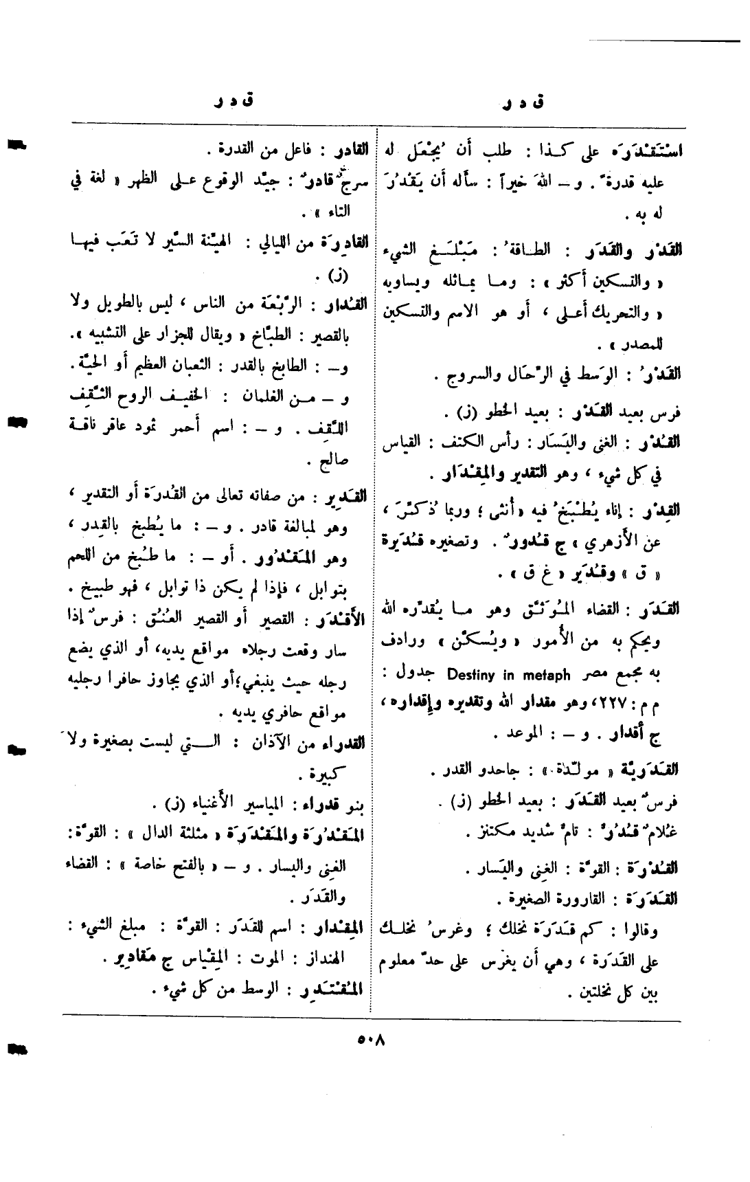القدر: القضاء الموثق وهو ما يقدره الله ويحكم به من الأمور "ويسكن" ورادف به مجمع مصر destiny in metaph جدول: م م: 227، وهو مقدار الله وتقديره وإقداره، ج أقدار. و-: الموعد.
