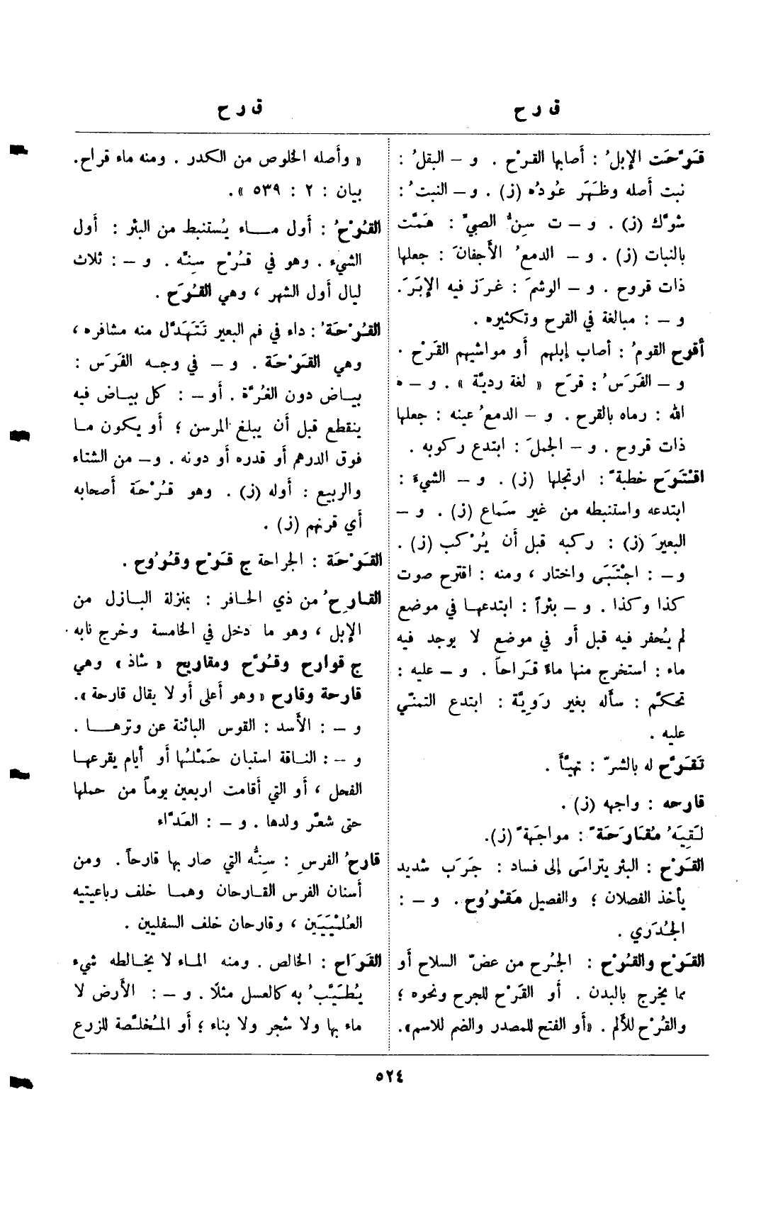 القارح من ذي الحافر: بمنزلة البازل من الإبل، وهو ما دخل في الخامسة وخرج نابه. ج قوارح وقرح ومقاريح "شاذ" وهي قارحة وقارح "وهو أعلى أو لا يقال قارحة". و-: الأسد: القوس البائنة عن وترها. و-: الناقة استبان حملها أو أيام يقرعها الفحل، أو التي أقامت اربعين يوما من حملها حتى شعر ولدها. و-: العداء.