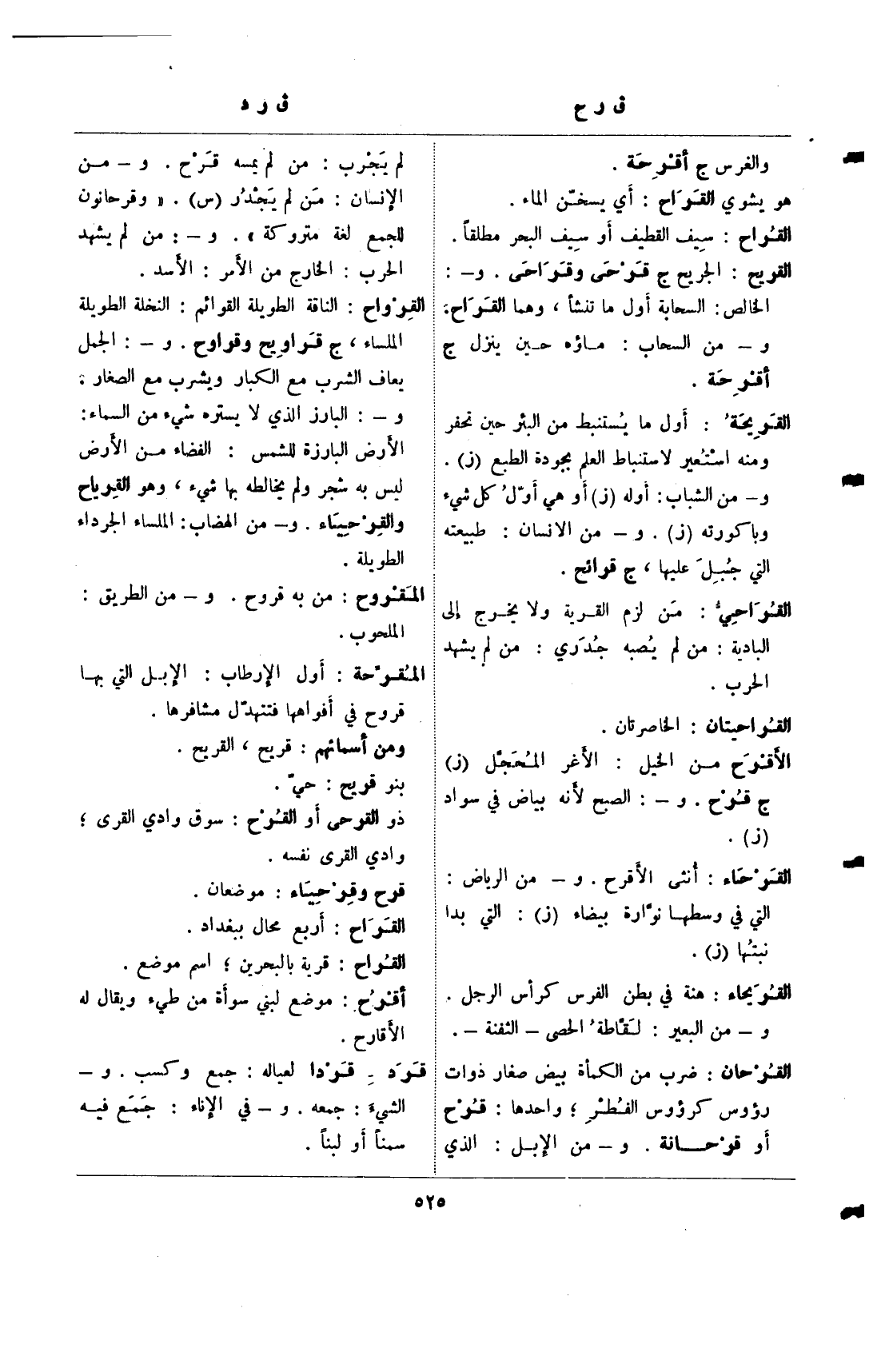 القرواح: الناقة الطويلة القوائم: النخلة الطويلة الملساء، ج قراويح وقراوح. و-: الجمل يعاف الشرب مع الكبار ويشرب مع الصغار. و-: البارز الذي لا يستره شيء من السماء: الأرض البارزة للشمس: الفضاء من الأرض ليس به شجر ولم يخالطه بها شيء، وهو القرياح والقرحياء. و- من الهضاب: الملساء الجرداء الطويلة.