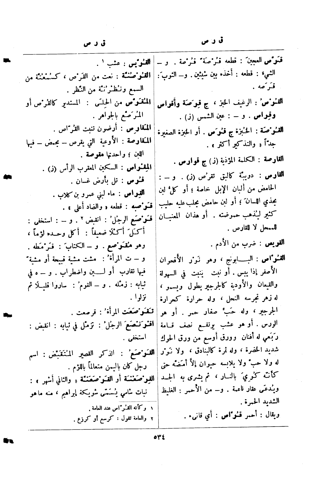 القراص: البابونج، وهو نور الأقحوان الأصفر إذا يبس. أو نبت ينبت في السهولة والقيعان والأودية كالجرجير يطول ويسمو، له زهر تجرسه النحل، وله حرارة كحرارة الجرجير، وله حب صغار حمر. أو هو الورس. أو هو عشب يرتفع نصف قامة ربعي له أفنان وورق أوسع من ورق الحوك شديد الخضرة، وله ثمرة كالبنادق، ولا نور له ولا حب ولا يلابسه حيوان إلا أمضه حتى كأنه كوي بالنار، ثم يشرى به الجسد ويدعى عقار ناعمة. و- من الأحمر: الغليظ الشديد الحمرة.