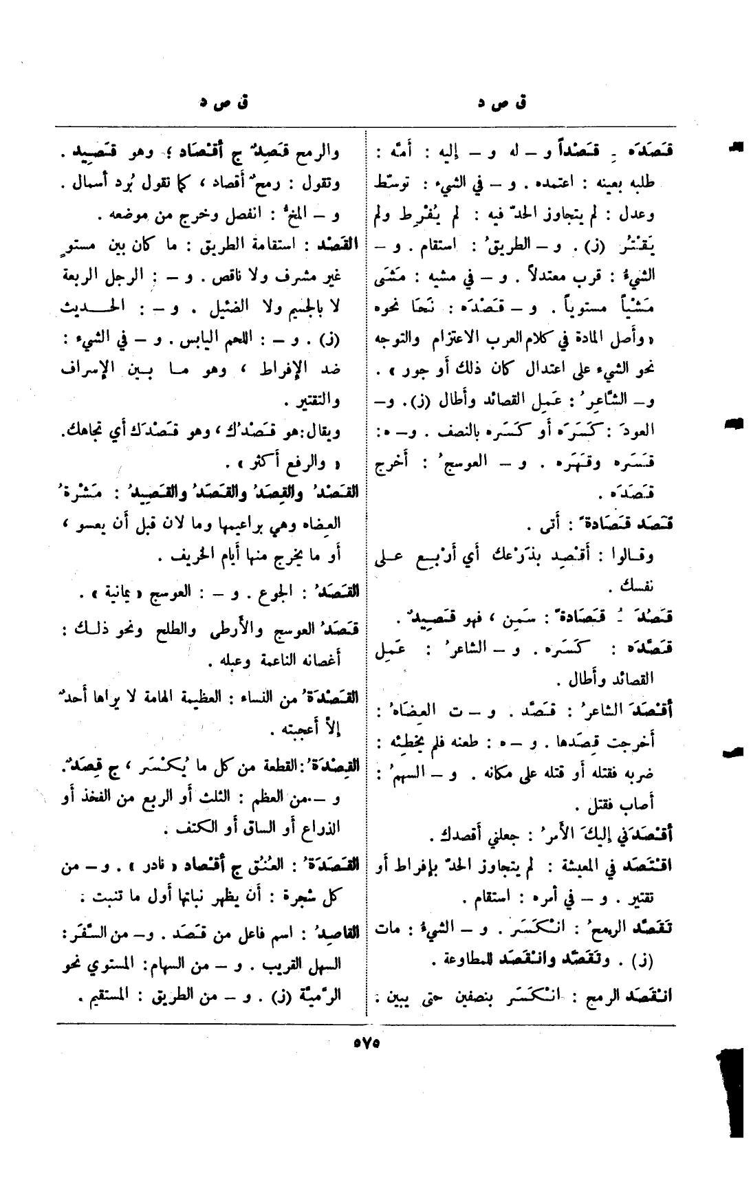 قصده- قصدا و- له و- إليه: أمه: طلبه بعينه: اعتمده. و- في الشيء: توسط وعدل: لم يتجاوز الحد فيه: لم يفرط ولم يقتر (ز). و- الطريق: استقام. و- الشيء: قرب معتدلا. و- في مشيه: مشى مشيا مستويا. و- قصده: نحا نحوه "وأصل المادة في كلام العرب الاعتزام والتوجه نحو الشيء على اعتدال كان ذلك أو جور". و- الشاعر: عمل القصائد وأطال (ز). و- العود: كسره أو كسره بالنصف. و- هـ: قسره وقهره. و- العوسج: أخرج قصده.