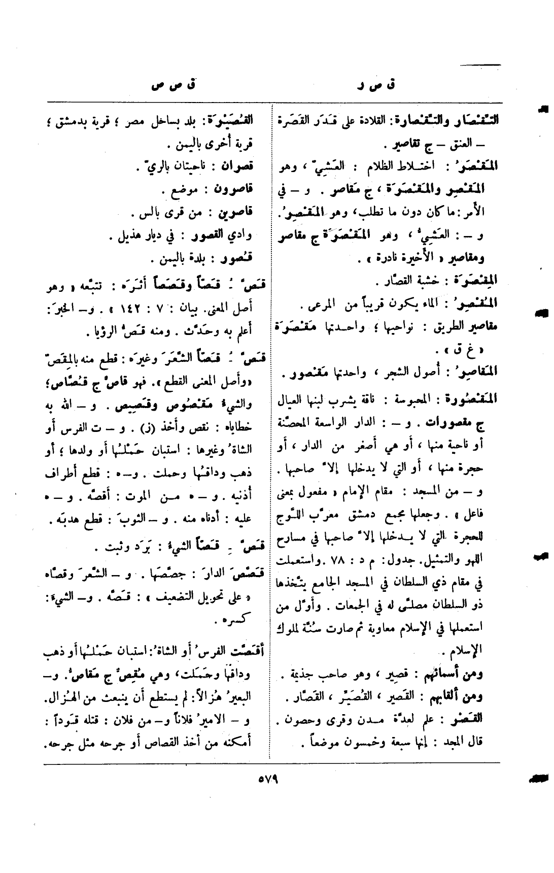 قص- قصا الشعر وغيره: قطع منه بالمقص "وأصل المعنى القطع". فهو قاص ج قصاص؛ والشيء مقصوص وقصيص. و- الله به خطاياه: نقص وأخذ (ز). و- ت الفرس أو الشاة وغيرها: استبان حملها أو ولدها؛ أو ذهب وداقها وحملت. و- هـ: قطع أطراف أذنيه. و- هـ من الموت: أقصه. و- هـ عليه: أدناه منه. و- الثوب: قطع هدبه.
