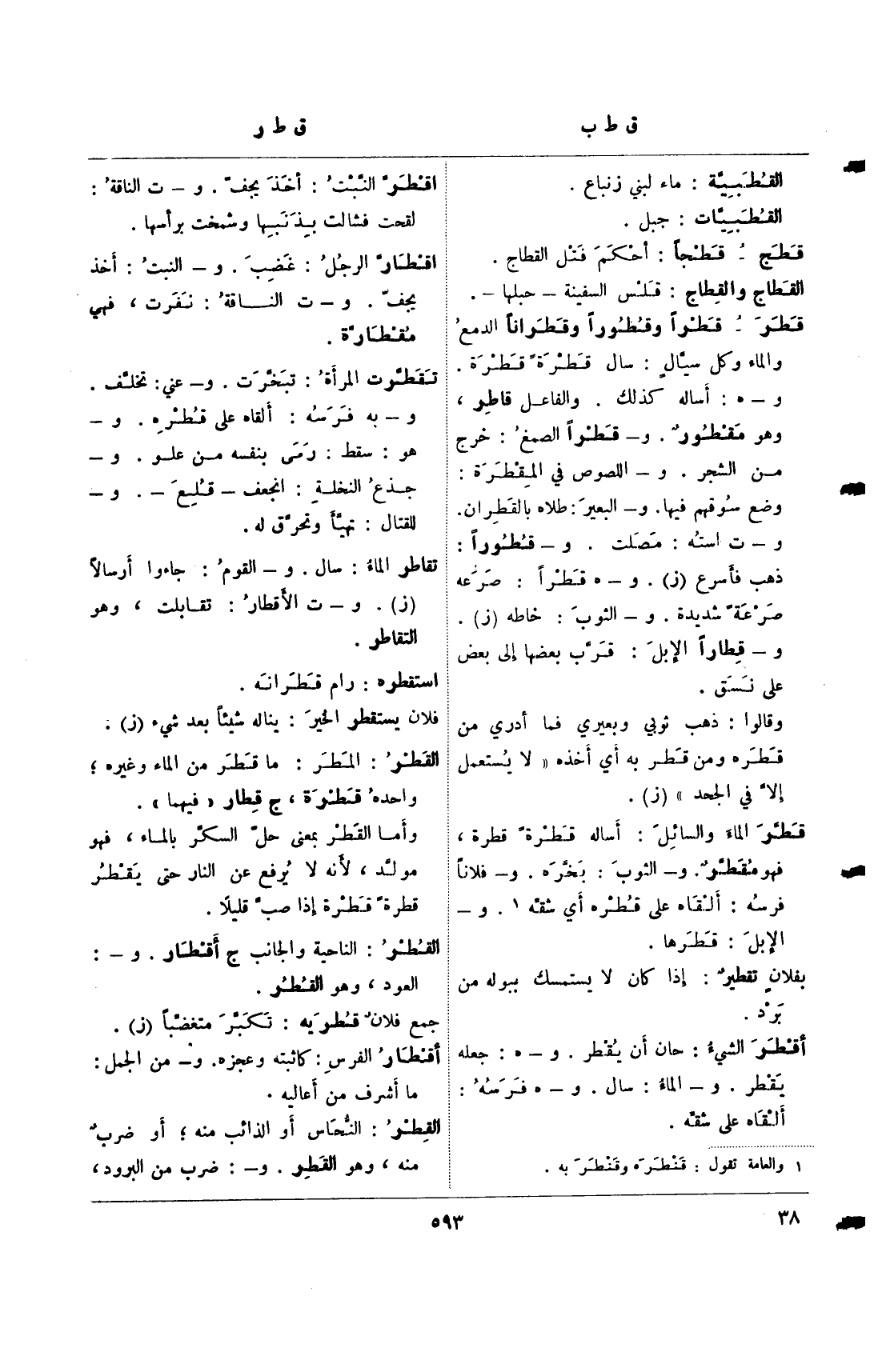 قطر- قطرا وقطورا وقطرانا الدمع والماء وكل سيال: سال قطرة قطرة. و- هـ: أساله كذلك. والفاعل قاطر، وهو مقطور. و- قطرا الصمغ: خرج من الشجر. و- اللصوص في المقطرة: وضع سوقهم فيها. و- البعير: طلاه بالقطران. و- ت استه: مصلت. و- قطورا: ذهب فأسرع (ز). و- هـ قطرا: صرعه صرعة شديدة. و- الثوب: خاطه (ز). و- قطارا الإبل: قرب بعضها إلى بعض على نسق.